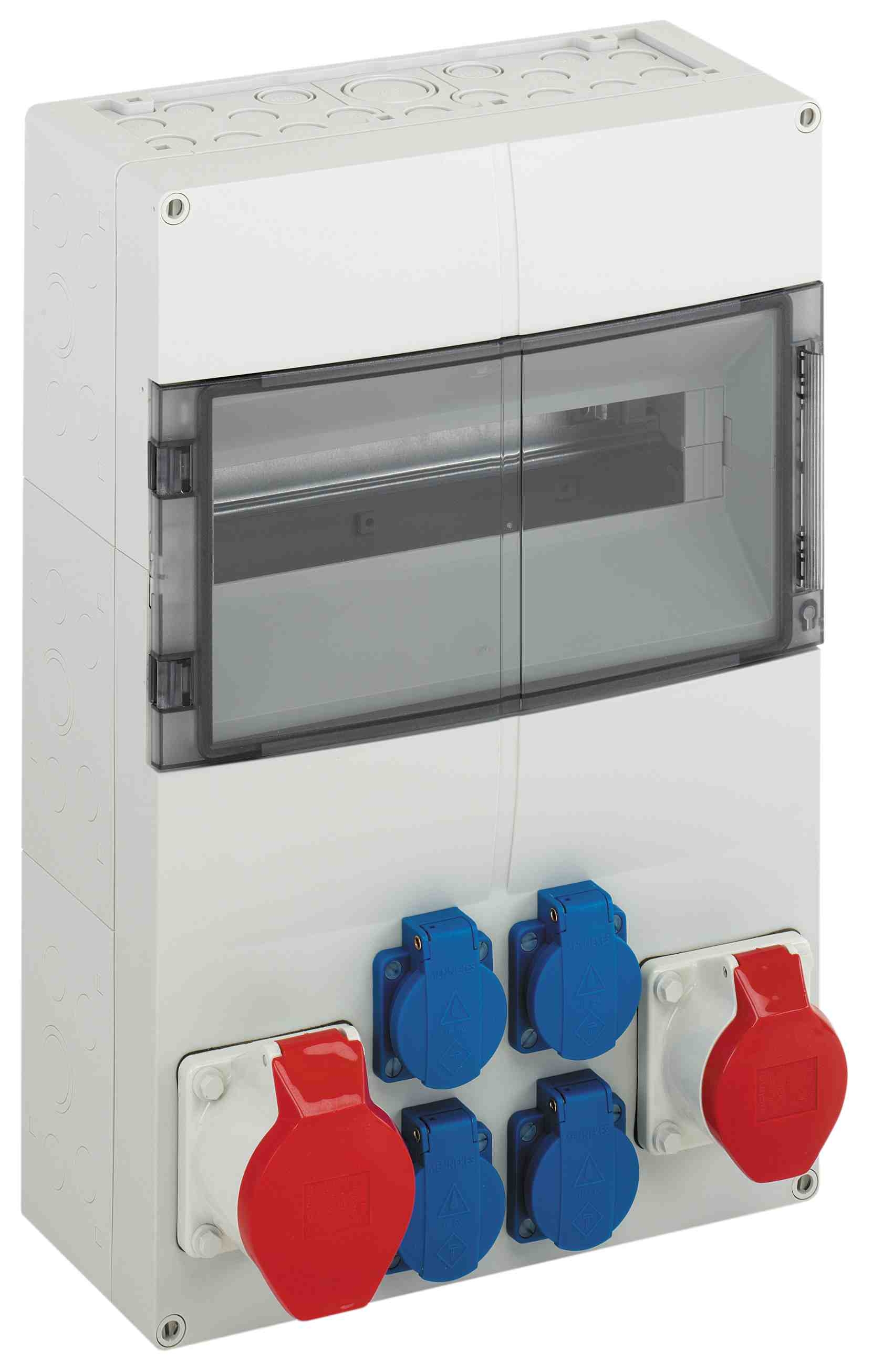 Zásuvková kombinace, se stupněm krytí IP44, vhodná k montáži řadových vestavných přístrojů zákazníkem, se zabudovanými zásuvkami, předběžně zapojenými do svorek PE/N, vysoká mechanická zatížitelnost, odolná vůči extrémním teplotám, kombinovatelná, bez halogenů, Dostupné moduly: 14 vybaveny: 4 x SCHUKO® zásuvka (na přední straně), 230 V 1 x Zásuvka CEE (na přední straně) 16 A, 400 V 1 x Zásuvka CEE (na přední straně) 32 A, 400 V  Rozměry: 300 x 450 x 142 mm Přiložené příslušenství: Dvojitá membránová vývodka: 1x M20, 1x M25, 1x M32, Vývodka: 1x M40, Zaslepovací zátky, Krycí a popisovací pásky