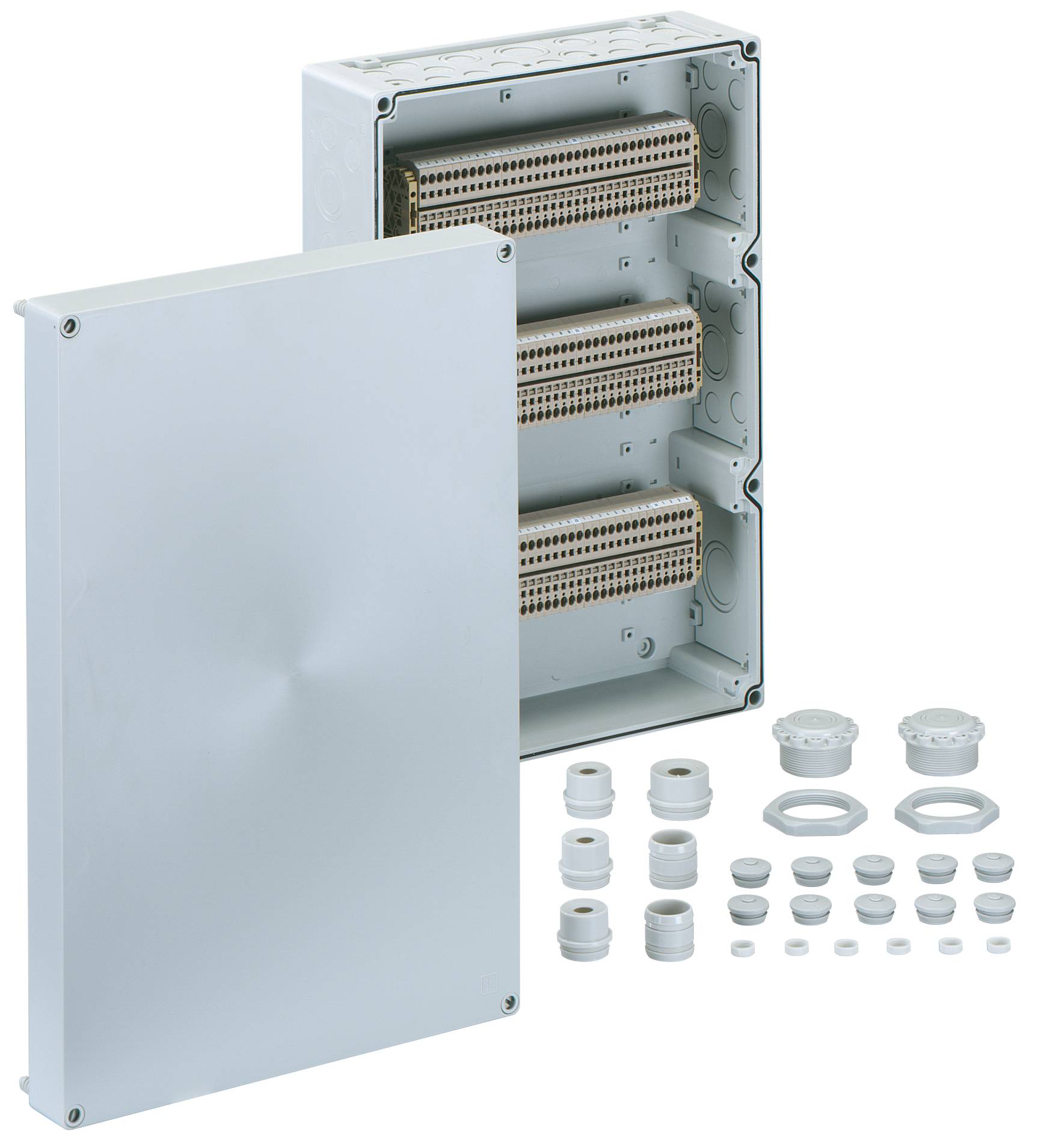 Skříň pro řadové svorkovnice, se stupněm krytí IP65, Jmenovitý průřez 4 mm?, Ui=400V AC, polykarbonát, Vnitřní místa pro připevnění, pro instalace v průmyslovém prostředí a chráněném venkovním prostředí, osazené 102 bezšroubovými svorkami 4 mm? (typ Weidmüller ZDU 4) Rozměry: 300 x 450 x 132 mm Přiložené příslušenství: 10Dvojitá membránová vývodka IP66 M20 Rozsah těsnění 7 - 12 mm, 2 Dvojitá membránová vývodka IP66 M25 Rozsah těsnění 9 - 16 mm, 2 Dvojitá membránová vývodka M32 Rozsah těsnění 14 - 21 mm, 1 Dvojitá membránová vývodka IP66 M40 Rozsah těsnění 19 - 28 mm