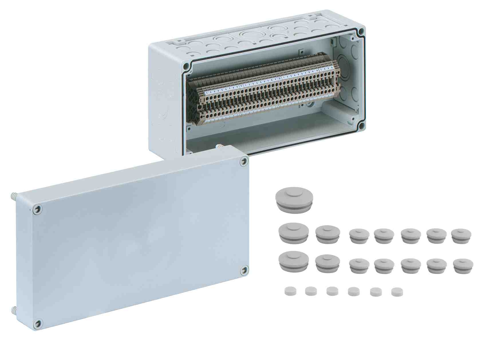 Skříň pro řadové svorkovnice, se stupněm krytí IP65, Jmenovitý průřez 4 mm?, Ui=400V AC, polykarbonát, Vnitřní místa pro připevnění, pro instalace v průmyslovém prostředí a chráněném venkovním prostředí, osazené 34 bezšroubovými svorkami 4 mm? (typ Weidmüller ZDU 4) Rozměry: 300 x 150 x 132 mm Přiložené příslušenství: 10Dvojitá membránová vývodka IP66 M20 Rozsah těsnění 7 - 12 mm, 2 Dvojitá membránová vývodka IP66 M25 Rozsah těsnění 9 - 16 mm, 2 Dvojitá membránová vývodka M32 Rozsah těsnění 14 - 21 mm, 1 Dvojitá membránová vývodka IP66 M40 Rozsah těsnění 19 - 28 mm