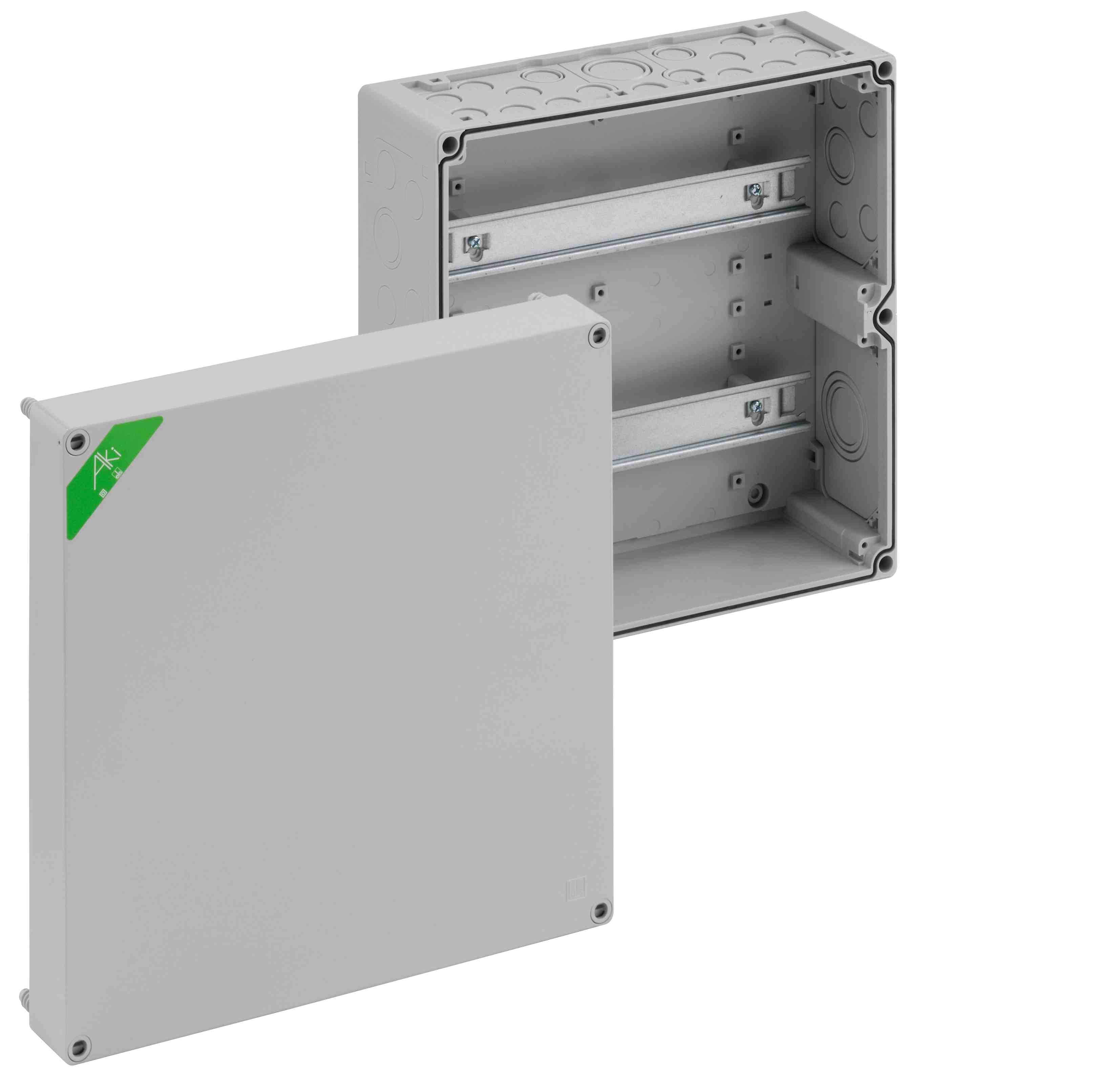 Skříň pro řadové svorkovnice, se stupněm krytí IP65, Jmenovitý průřez 4 mm?, Ui=400V AC, polykarbonát, Vnitřní místa pro připevnění, pro instalace v průmyslovém prostředí a chráněném venkovním prostředí, bez svorek, s nosnými lištami NS35 Rozměry: 300 x 300 x 132 mm Přiložené příslušenství: 10Dvojitá membránová vývodka IP66 M20 Rozsah těsnění 7 - 12 mm, 2 Dvojitá membránová vývodka IP66 M25 Rozsah těsnění 9 - 16 mm, 2 Dvojitá membránová vývodka M32 Rozsah těsnění 14 - 21 mm, 1 Dvojitá membránová vývodka IP66 M40 Rozsah těsnění 19 - 28 mm
