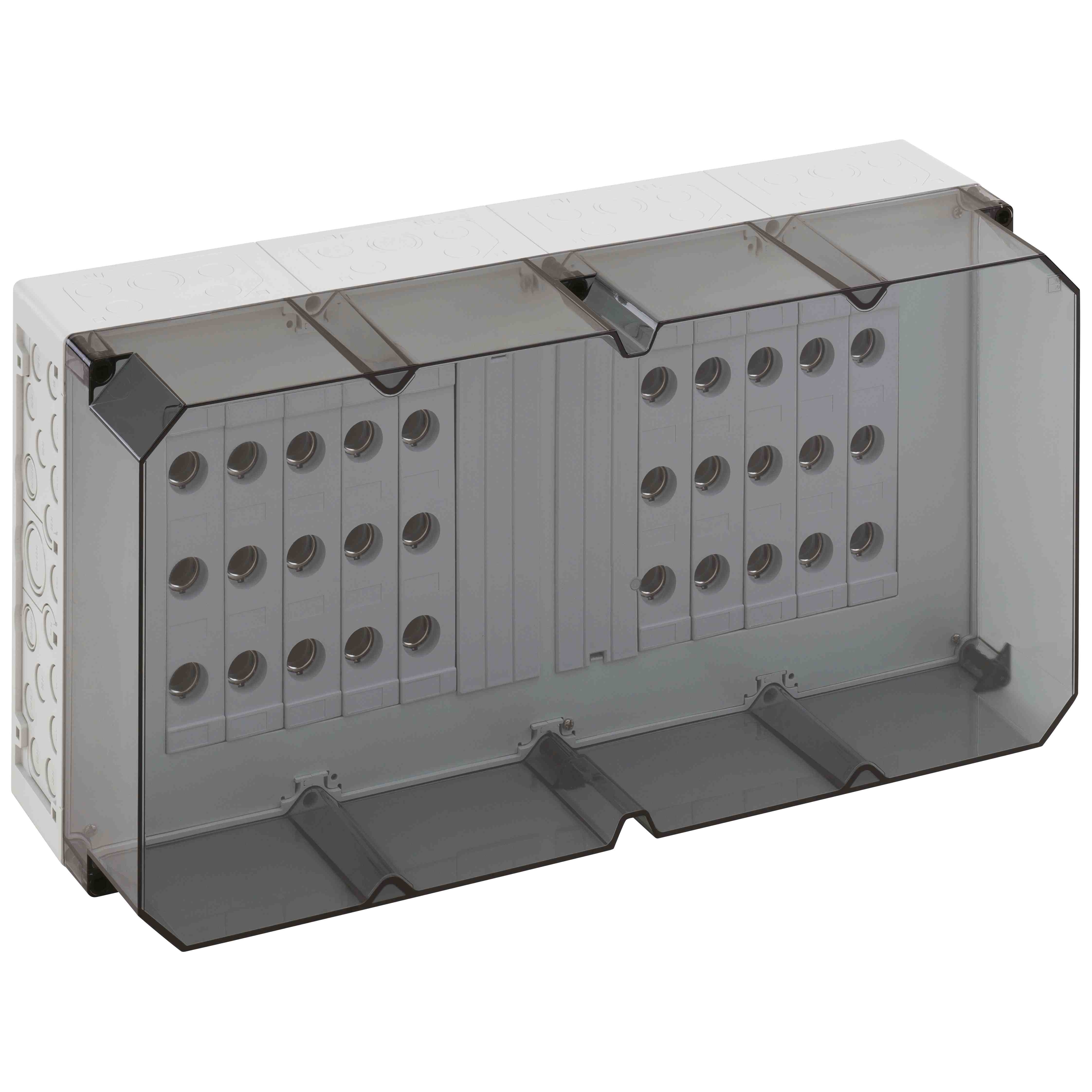 NEOZED® skříň pro jezdcové pojistky - průmyslová kvalita -, 10 x 3 póly D02 patice jezdcové pojistky, E 18 závit, Jmenovitý proud 63 A, Šroubovací přípojka 1,5 - 25 mm?, na sběrnici, 5 pólů, N svorky 1,5 - 16 mm?, PE svorky 1,5 - 16 mm?, na systém přípojnic 250 A, s transparentním víkem Rozměry: 600 x 300 x 210 mm