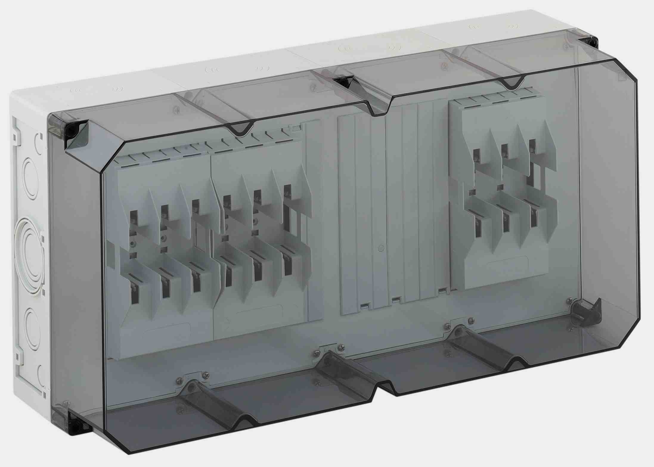 NH skříň pro jezdcové pojistky - průmyslová kvalita -, 3 x NH 00 spodek jezdcové pojistky, Jmenovitý proud 100 A, Připojení objímky 1,5 - 70 mm?, Výstup nahoře, na sběrnici, 5 pólů, s 5 přípojnicovými svorkami 16 - 70 mm?, N svorky 4 - 35 mm?, PE svorky 4 - 35 mm?, s izolační krytkou, na systém přípojnic 250 A, s transparentním víkem Rozměry: 600 x 300 x 210 mm