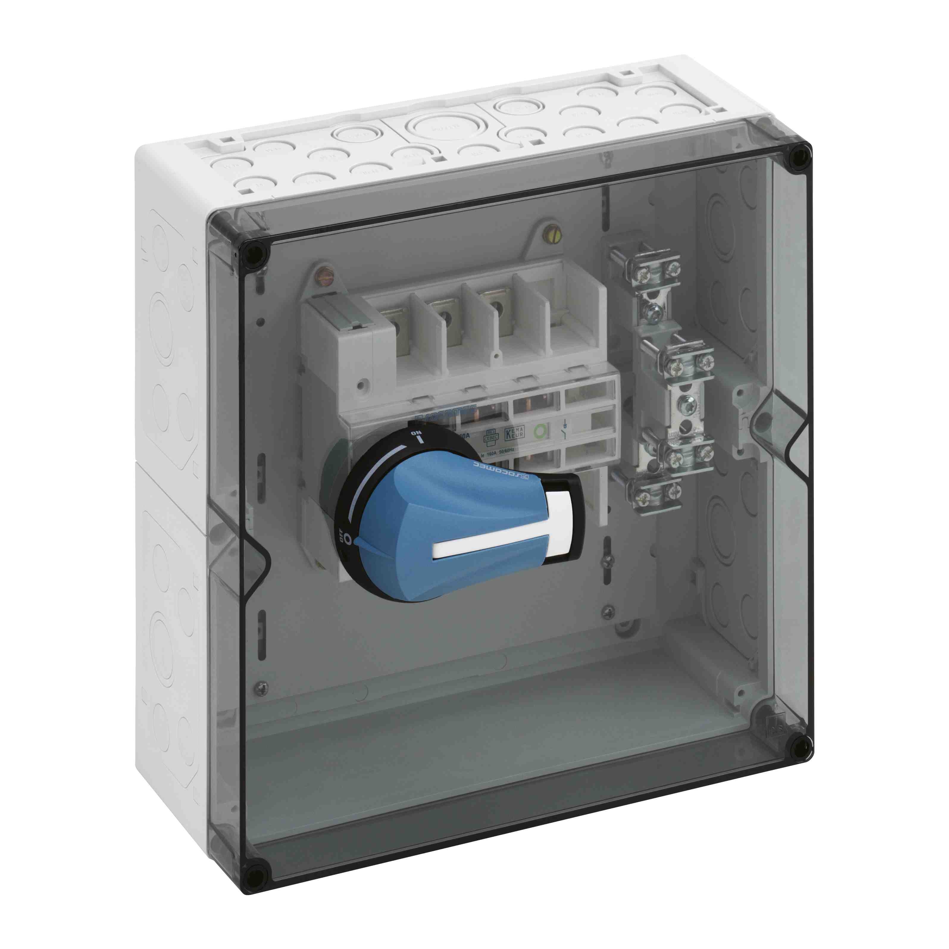 Skříň pro výkonové vypínače - průmyslová kvalita - s externím ovládáním, uzamykatelná, IP65 (při použití odpovídajících kabelových přívodů), 1 x výkonový vypínač 160A, 3pólové přepínání, Klecová svorkovnice 10 - 70 mm?, PE/N svorka 2 x 50 mm?, s vývodkami IP54, s izolační krytkou, s transparentním víkem Rozměry: 300 x 300 x 132 mm