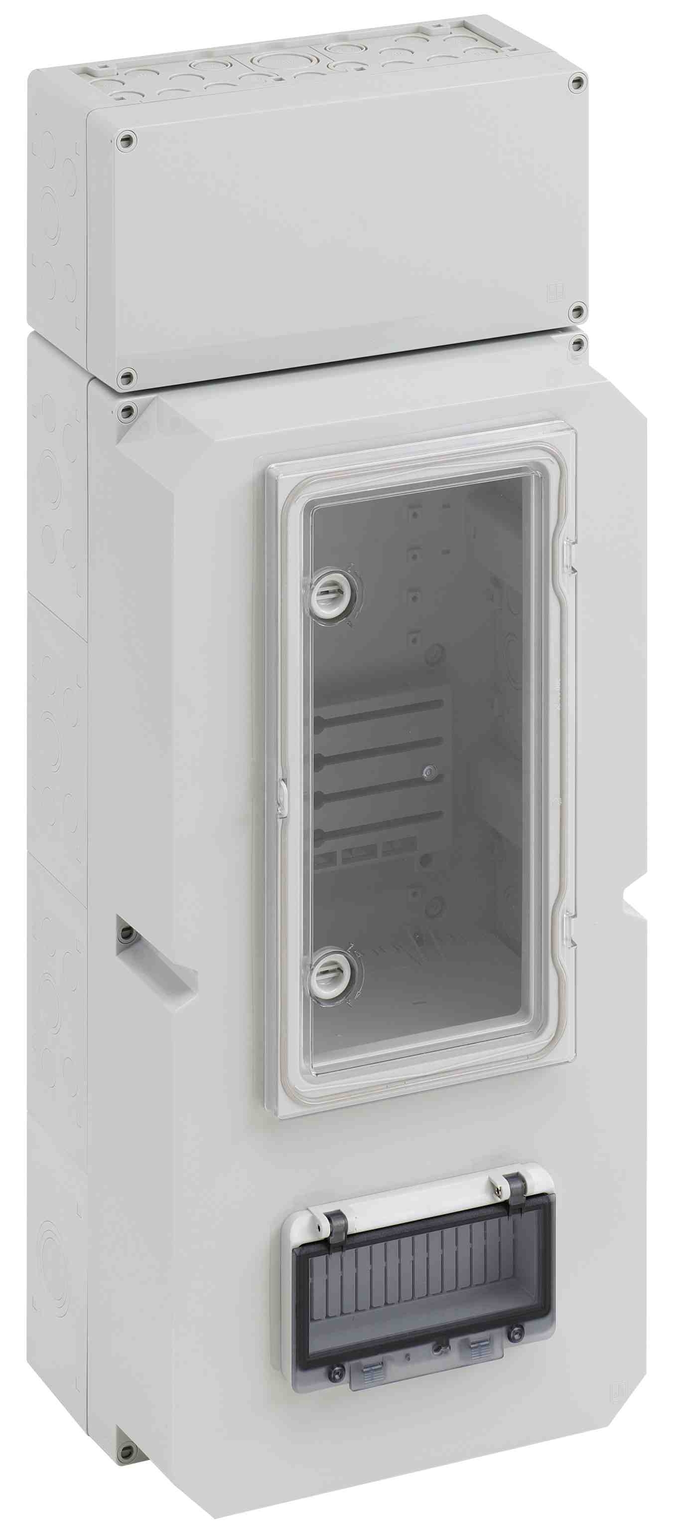 Skříň elektroměru - průmyslová kvalita -, víko šedé, sériově plombovatelné, s průhledným vyklápěcím oknem, s namontovaným křížem elektroměru pro třífázový elektroměr a upevňovacími šrouby elektroměru, s dodatečným vyklápěcím oknem k obsluze selektivního hlavního vypínače, vč. 2 jednopólových svorek HA 25/16 mm? pro N a PE, s 35 mm lištou k vestavbě selektivního hlavního vypínače, s dodatečným propojovacím prostorem 150 mm nahoře, s 35 mm lištou, s dvojitou membránovou vývodkou, uzavírací a izolační zátkou, Rozměry: 300 x 750 x 210 mm