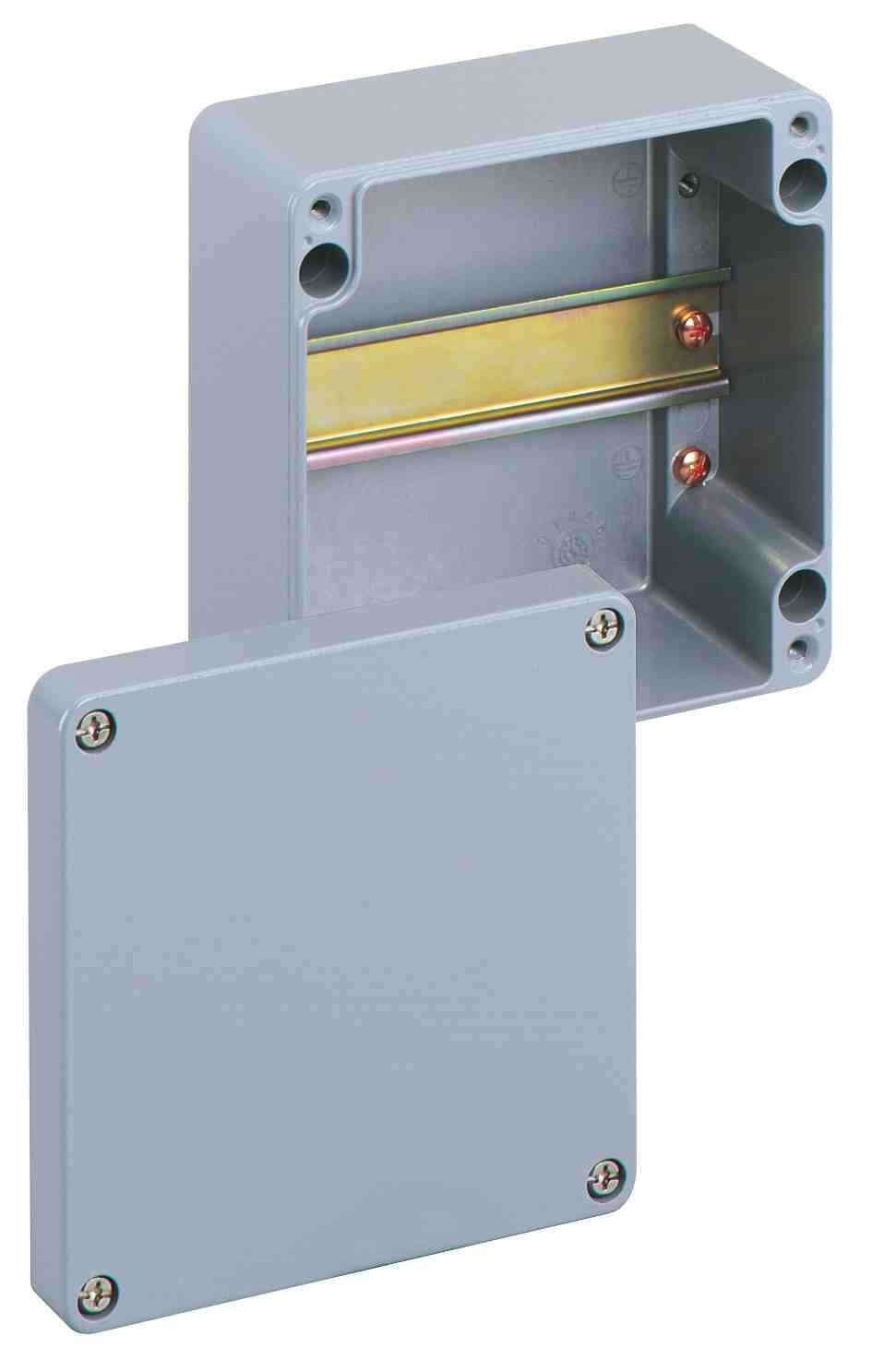 Skříň pro řadové svorkovnice, se stupněm krytí IP66, Jmenovitý průřez 4 mm?, Ui=400V AC, Hliník s práškovým lakováním, Vnitřní místa pro připevnění, pro instalace v průmyslovém prostředí a chráněném venkovním prostředí, bez svorek, s nosnou lištou NS35 Rozměry: 160 x 160 x 91 mm