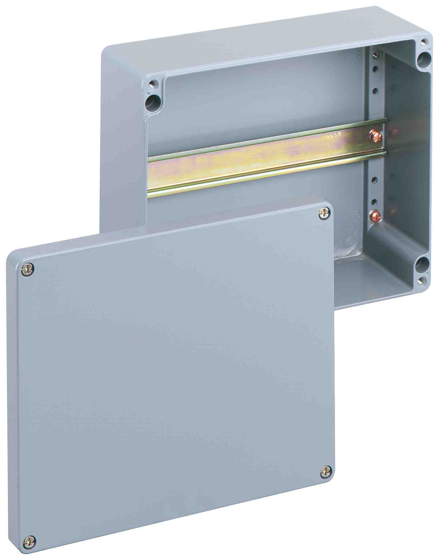 Skříň pro řadové svorkovnice, se stupněm krytí IP66, Jmenovitý průřez 4 mm?, Ui=400V AC, Hliník s práškovým lakováním, Vnitřní místa pro připevnění, pro instalace v průmyslovém prostředí a chráněném venkovním prostředí, bez svorek, s nosnou lištou NS35 Rozměry: 280 x 230 x 111 mm