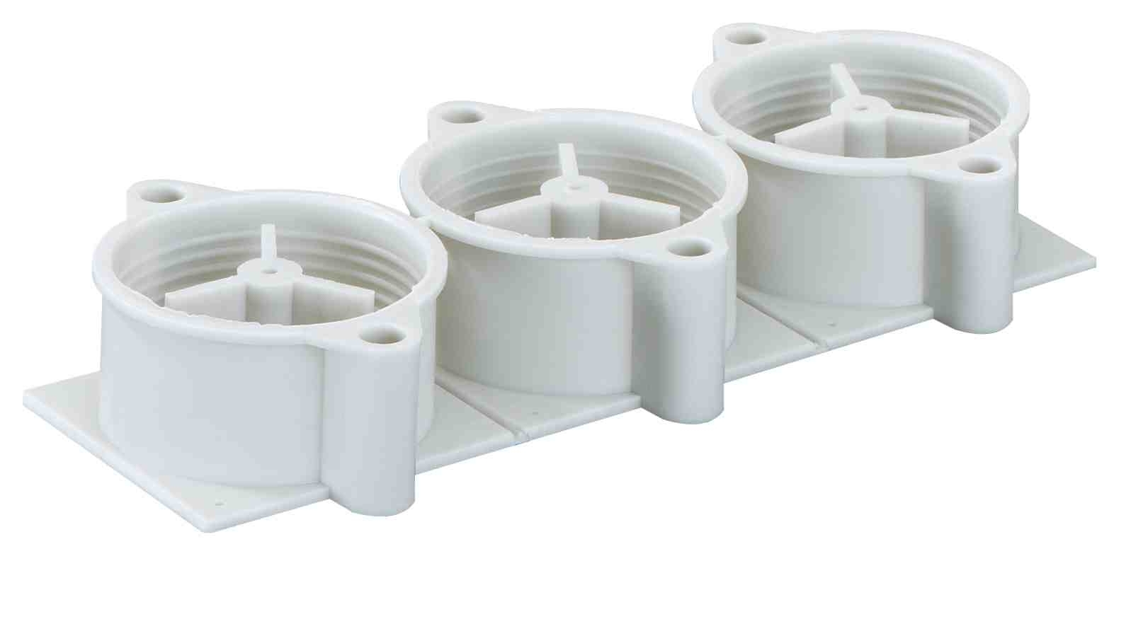 Opěrka, podklad pro podpěru trubkových kolen, včetně potrubních pouzder, pro protilehlé bednění ve spojení s podpěrnými vzpěrami, pro trubkové vývodky 970 523 01 / 970 530 01 Rozměry: 64 x 49 x 22 mm