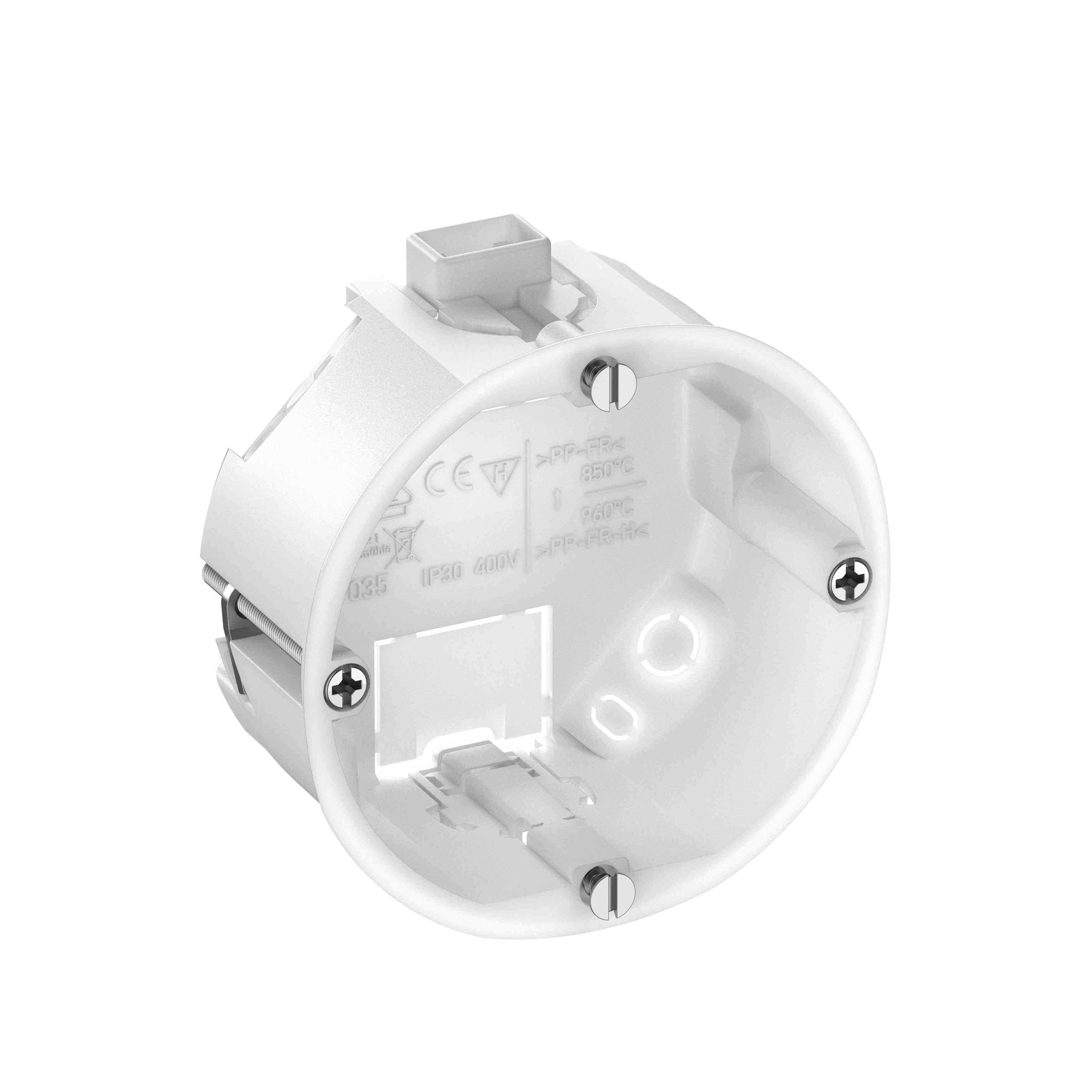 Plochá krabice do dutých stěn, samozhášivá a bez halogenů, speciální krabice s malou vestavnou hloubkou (35 mm), pro tenké stěny s tloušťkami desek 1 - 20 mm, s nastříkanými, patentovanými kombinovanými můstky, rozteč šroubů pro montáž přístrojů 60 mm, bez halogenů, Vyvrtaný otvor ? 68 mm, hloubka 35 mm Rozměry: 68 x 68 x 35 mm