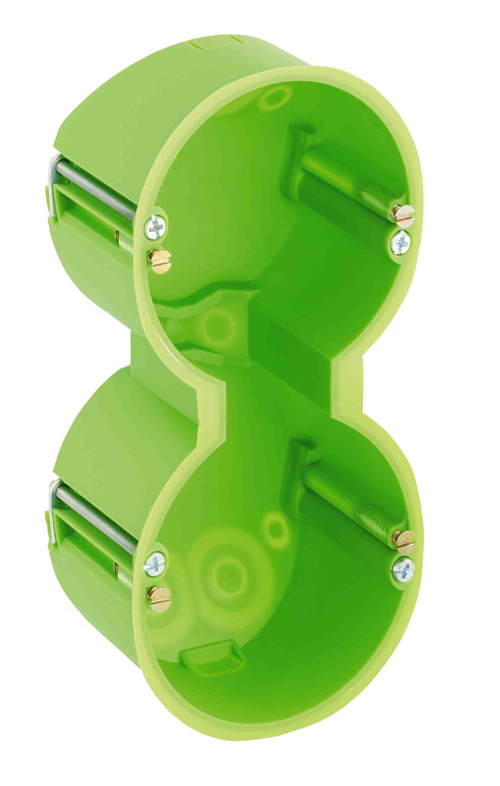 Dvojitá přístrojová krabice do dutých stěn, samozhášivá, pro tloušťku desek 1 až 40 mm, s integrovaným patentovaným spojovacím můstkem, včetně děrovacího nástroje, rozteč šroubů pro montáž přístrojů 60 mm, s uzavřenými membránovými vstupy, Vyvrtaný otvor ? 2 x 68 mm, hloubka 50 mm, Rozteč pro spojení 71 mm Rozměry: 68 x 139 x 50 mm