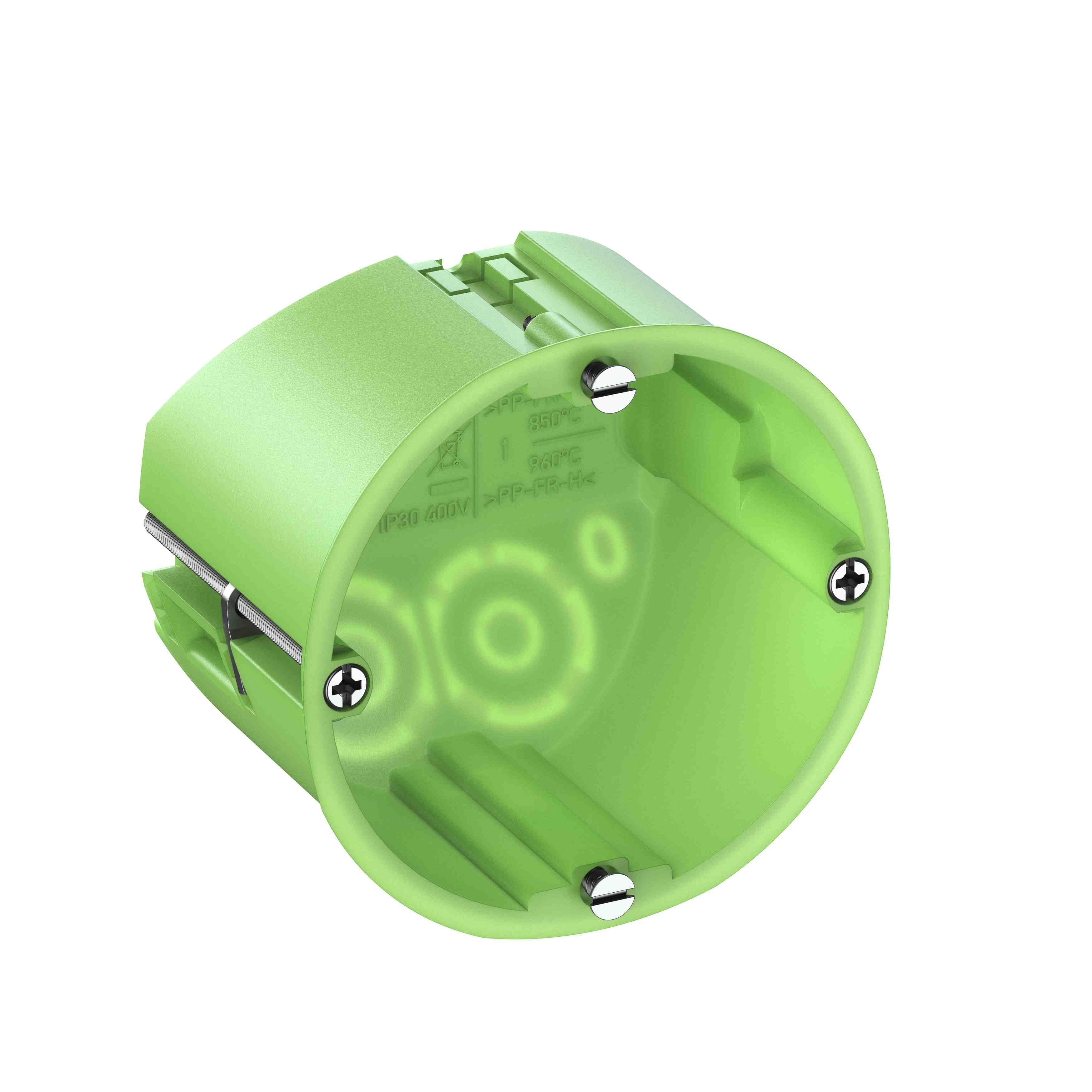 Krabice do dutých stěn, samozhášivá, univerzální krabice pro tloušťku desek 1 až 40 mm, s integrovaným patentovaným spojovacím můstkem, včetně děrovacího nástroje, rozteč šroubů pro montáž přístrojů 60 mm, s uzavřenými membránovými vstupy, Vyvrtaný otvor ? 68 mm, hloubka 50 mm Rozměry: 68 x 68 x 50 mm