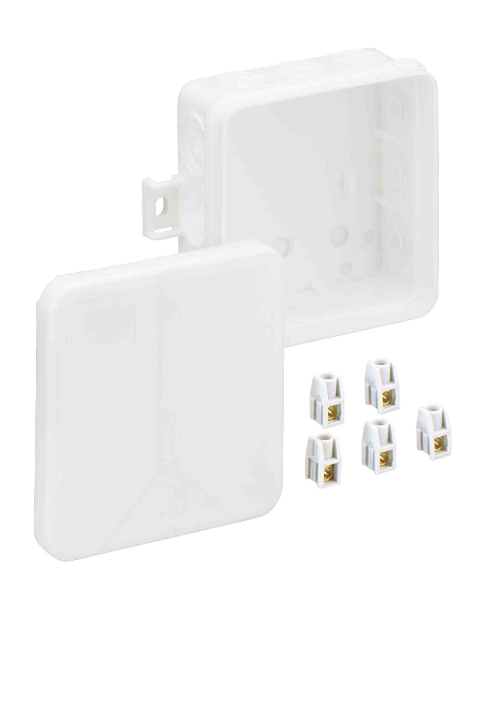 Rozbočovací krabice, se stupněm krytí IP55, Jmenovitý průřez 2,5 mm?, Ui=400V AC, Certifikováno VDE (DIN EN 60670-1/-22 (VDE 0606-1/-22)), Samotěsnicí přívodní membrány, Rozsah těsnění 8,2 - 12,5 mm, (3 Zpětné, 12 bočně), Vnitřní místa pro připevnění, pro standardní instalace ve vnitřním prostoru, bílá, s 5 k sobě řaditelnými šroubovými svorkami 2,5 mm? (5 x1? / 5 x 1,5? / 3 x 2,5?) Rozměry: 85 x 85 x 37 mm