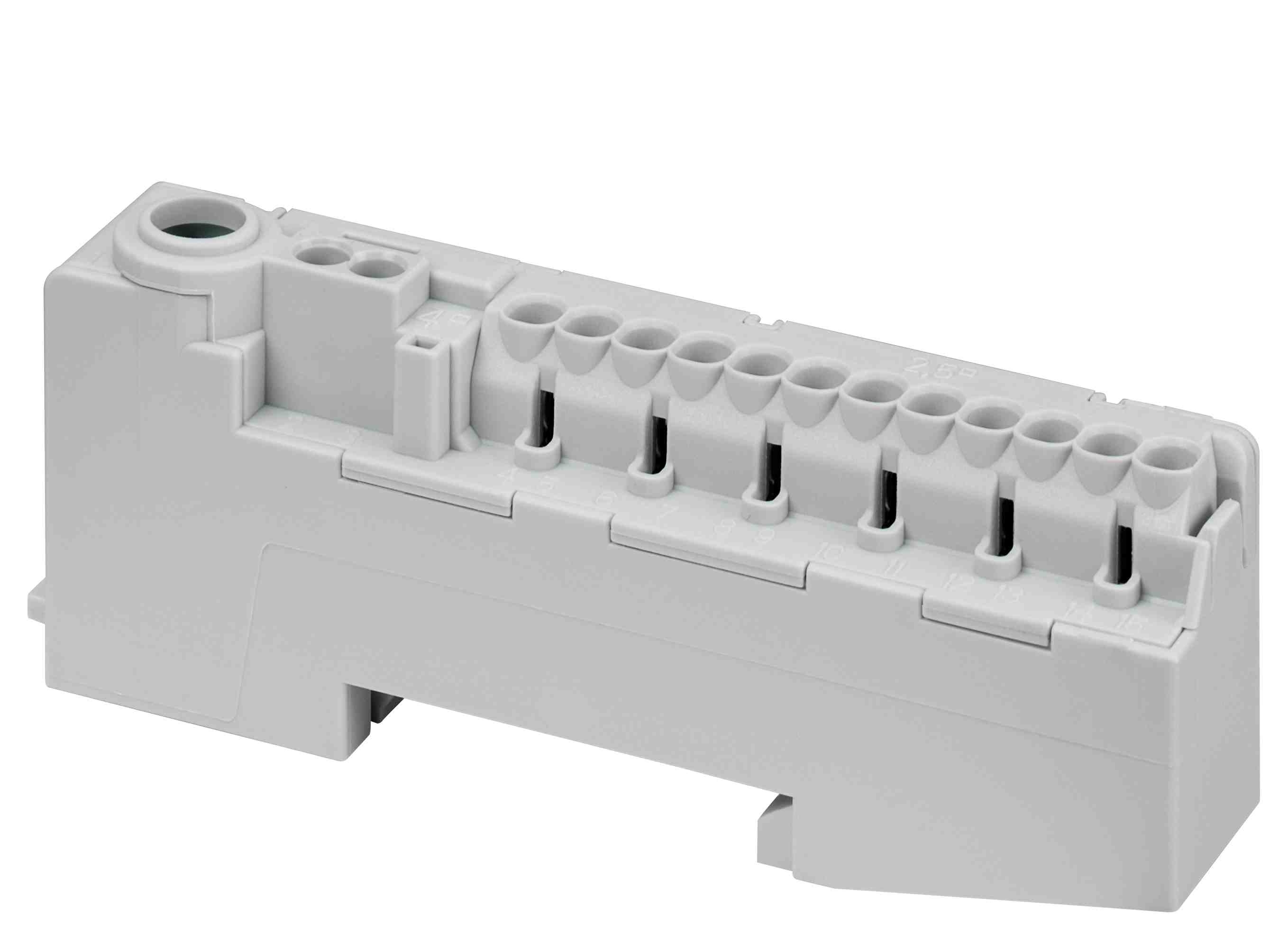 Svorka, pro tuhé vodiče, 15 míst upnutí, 1x šroubovací místo upnutí 25 mm? (1,5-25 mm? re, 1-16 mm? rf+AD) , 2x bezšroubové místo upnutí 4 mm? (1-4 mm? re, 1-2,5 mm? rf+AD), 12x bezšroubová místa upnutí 2,5 mm? (1-2,5 mm? re, 0,75-1,5 mm? rf+AD), k montáži na nosné lišty DIN 35 mm, při proudové zatížitelnosti 76 A, šedá Rozměry: 94 x 35 x 17 mm