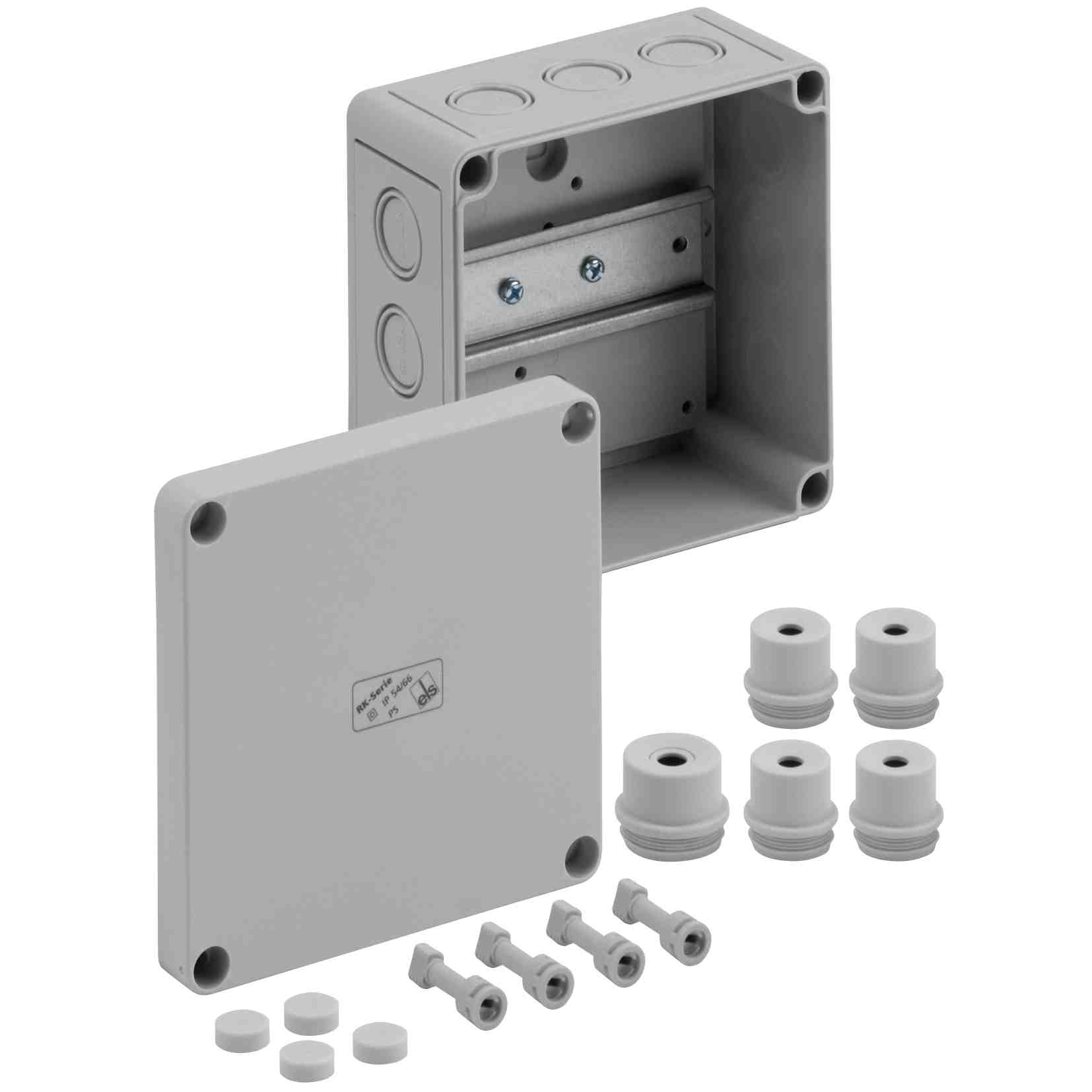 Skříň pro řadové svorkovnice, se stupněm krytí IP54/IP66, Jmenovitý průřez 4 mm?, Ui=400V AC, polystyren, Vnitřní místa pro připevnění, pro standardní instalace ve vnitřním prostoru, bez svorek, s nosnou lištou NS35 Rozměry: 130 x 130 x 75 mm Přiložené příslušenství: 4 Vývodka IP54 M20 Rozsah těsnění 8 - 13,5 mm, 1 Vývodka IP54 M25 Rozsah těsnění 9 - 18,5 mm