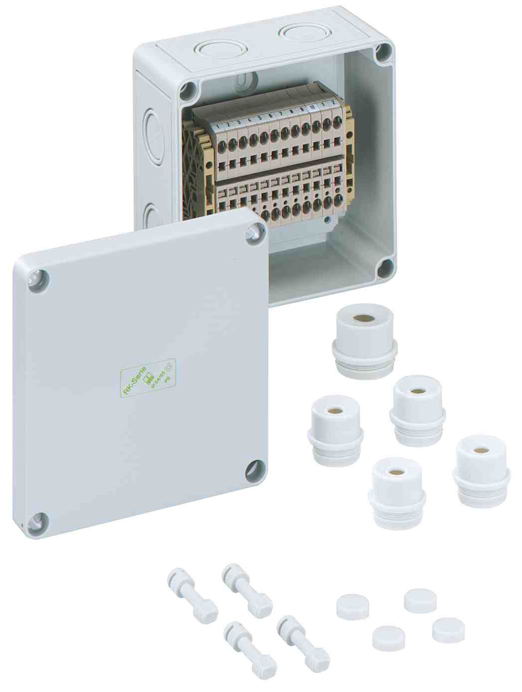 Skříň pro řadové svorkovnice, se stupněm krytí IP54/IP66, Jmenovitý průřez 4 mm?, Ui=400V AC, polystyren, Vnitřní místa pro připevnění, pro standardní instalace ve vnitřním prostoru, osazené 12 bezšroubovými svorkami 4 mm? (typ Weidmüller ZDU 4) Rozměry: 130 x 130 x 75 mm Přiložené příslušenství: 4 Vývodka IP54 M20 Rozsah těsnění 8 - 13,5 mm, 1 Vývodka IP54 M25 Rozsah těsnění 9 - 18,5 mm
