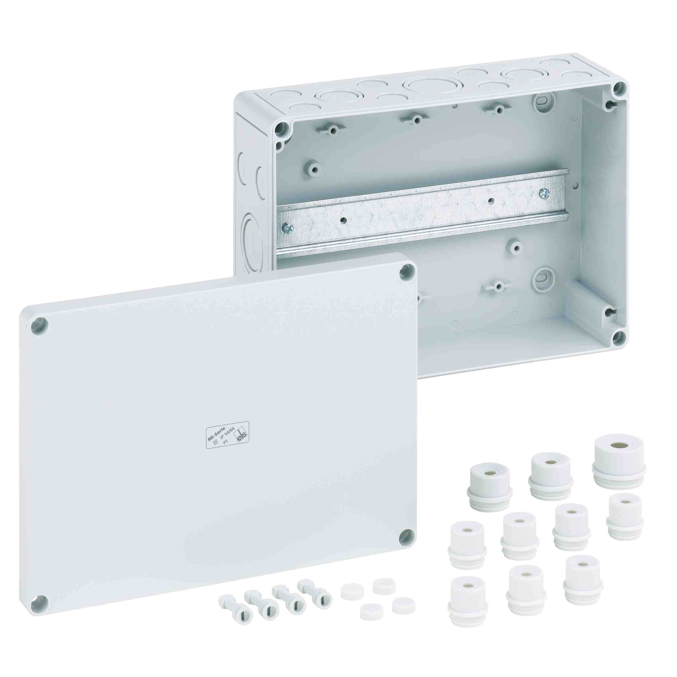 Skříň pro řadové svorkovnice, se stupněm krytí IP54/IP66, Jmenovitý průřez 4 mm?, Ui=400V AC, polystyren, Vnitřní místa pro připevnění, pro standardní instalace ve vnitřním prostoru, bez svorek, s nosnou lištou NS35 Rozměry: 254 x 180 x 90 mm Přiložené příslušenství: 8 Vývodka IP54 M20 Rozsah těsnění 8 - 13,5 mm, 2 Vývodka IP54 M25 Rozsah těsnění 9 - 18,5 mm, 1 Vývodka IP54 M32 Rozsah těsnění 13 - 23 mm
