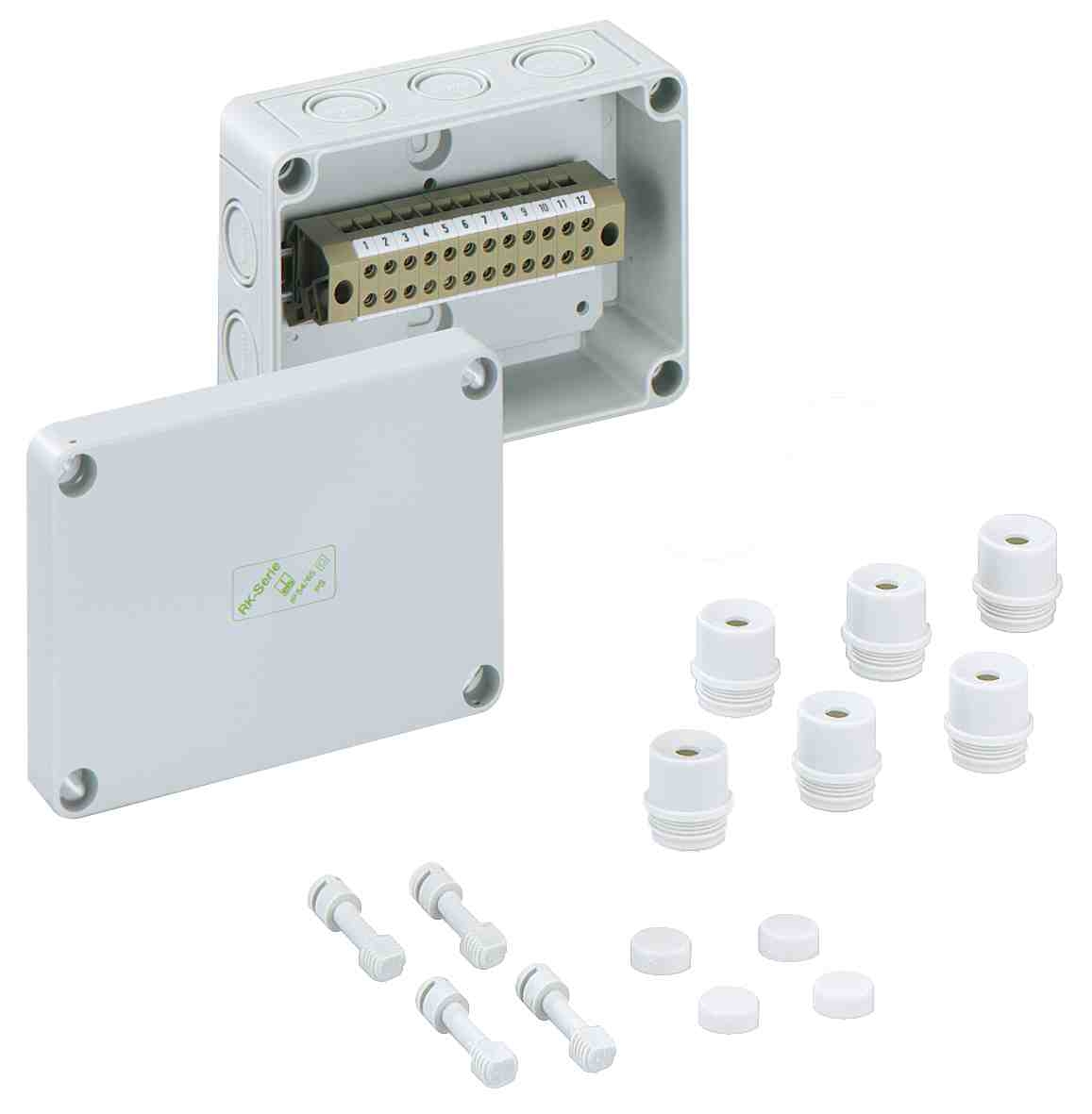 Skříň pro řadové svorkovnice, se stupněm krytí IP54/IP66, Jmenovitý průřez 4 mm?, Ui=400V AC, polystyren, Vnitřní místa pro připevnění, pro standardní instalace ve vnitřním prostoru, osazené 12-pólovou blokovou svorkou 4 mm? (typ Contaclip BKA 4) Rozměry: 130 x 94 x 57 mm Přiložené příslušenství: 6 s vývodkami IP54 M20, rozsah těsnění 8 - 13,5 mm