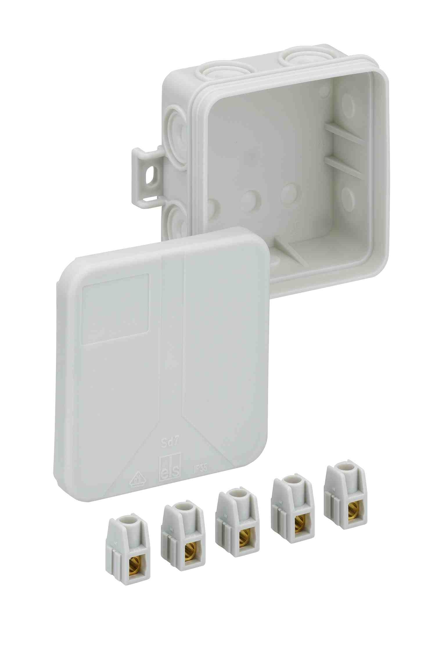 Rozbočovací krabice, se stupněm krytí IP55, Jmenovitý průřez 2,5 mm?, Ui=400V AC, Certifikováno VDE (DIN EN 60670-1/-22 (VDE 0606-1/-22)), Samotěsnicí přívodní membrány, Rozsah těsnění 8,2 - 12,5 mm, (3 Zpětné, 7 bočně), Vnitřní místa pro připevnění, pro standardní instalace ve vnitřním prostoru, šedá, s 5 k sobě řaditelnými šroubovými svorkami 2,5 mm? (5 x1? / 5 x 1,5? / 3 x 2,5?) Rozměry: 75 x 75 x 37 mm