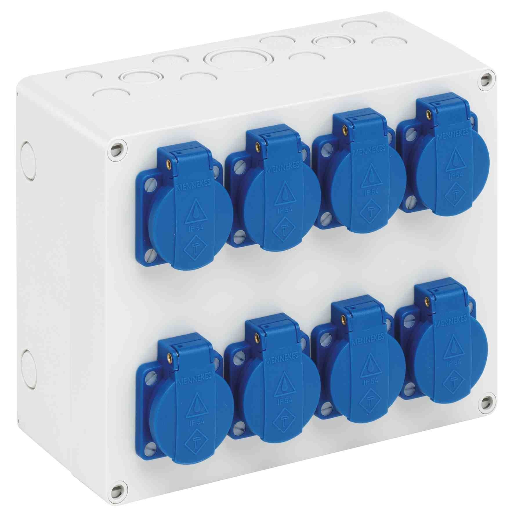 Zásuvková skříň, se stupněm krytí IP44, s vestavěnými, předem zapojenými zásuvkami, vysoká mechanická zatížitelnost, odolná vůči extrémním teplotám, kombinovatelná, bez halogenů, vybaveny: 8 x SCHUKO® zásuvka (na přední straně), 230 V Rozměry: 250 x 200 x 122 mm Přiložené příslušenství: Vývodka: 2x M25, 2x M32, Zaslepovací zátky