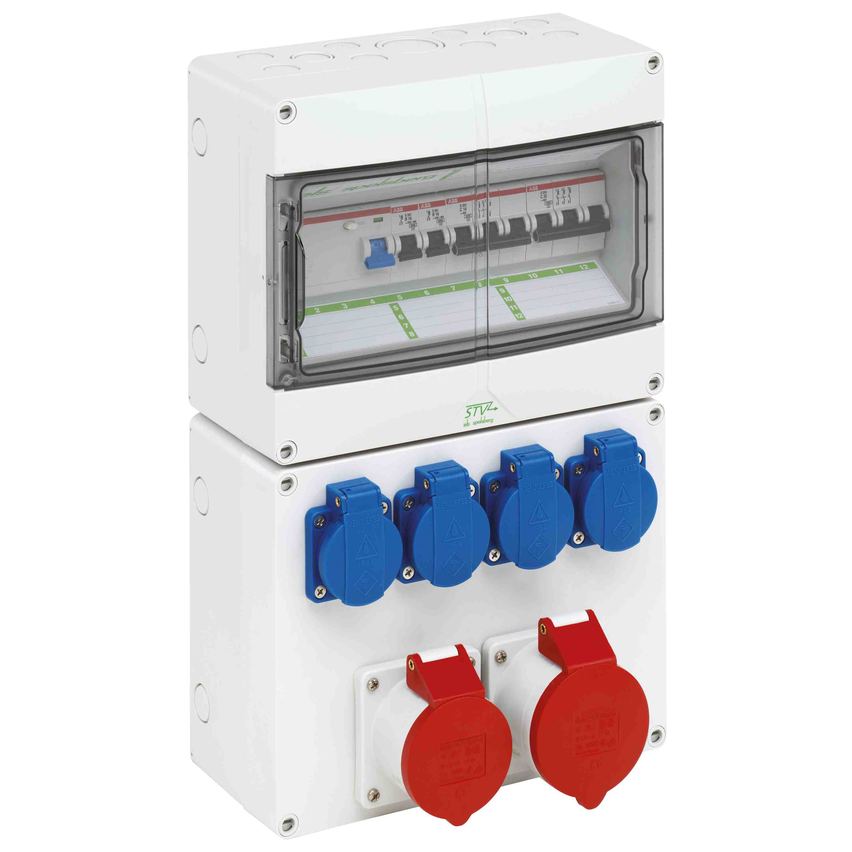 Zásuvková kombinace, se stupněm krytí IP44, připravená k zapojení, podle EN 61439-3, vysoká mechanická zatížitelnost, odolná vůči extrémním teplotám, kombinovatelná, vybaveny: 1 x Proudový chránič (RCCB), 40/0,03A, 4-pólový, typ A 2 x Výkonový spínač V16A, 1-pólový 1 x Výkonový spínač C16A, 3-pólový 1 x Výkonový spínač C32A, 3-pólový 4 x SCHUKO® zásuvka (na přední straně), 230 V 1 x Zásuvka CEE (na přední straně) 16 A, 400 V 1 x Zásuvka CEE (na přední straně) 32 A, 400 V  Rozměry: 250 x 400 x 122 mm Přiložené příslušenství: Vývodka: 2x M25, 2x M32, Zaslepovací zátky, Krycí a popisovací pásky