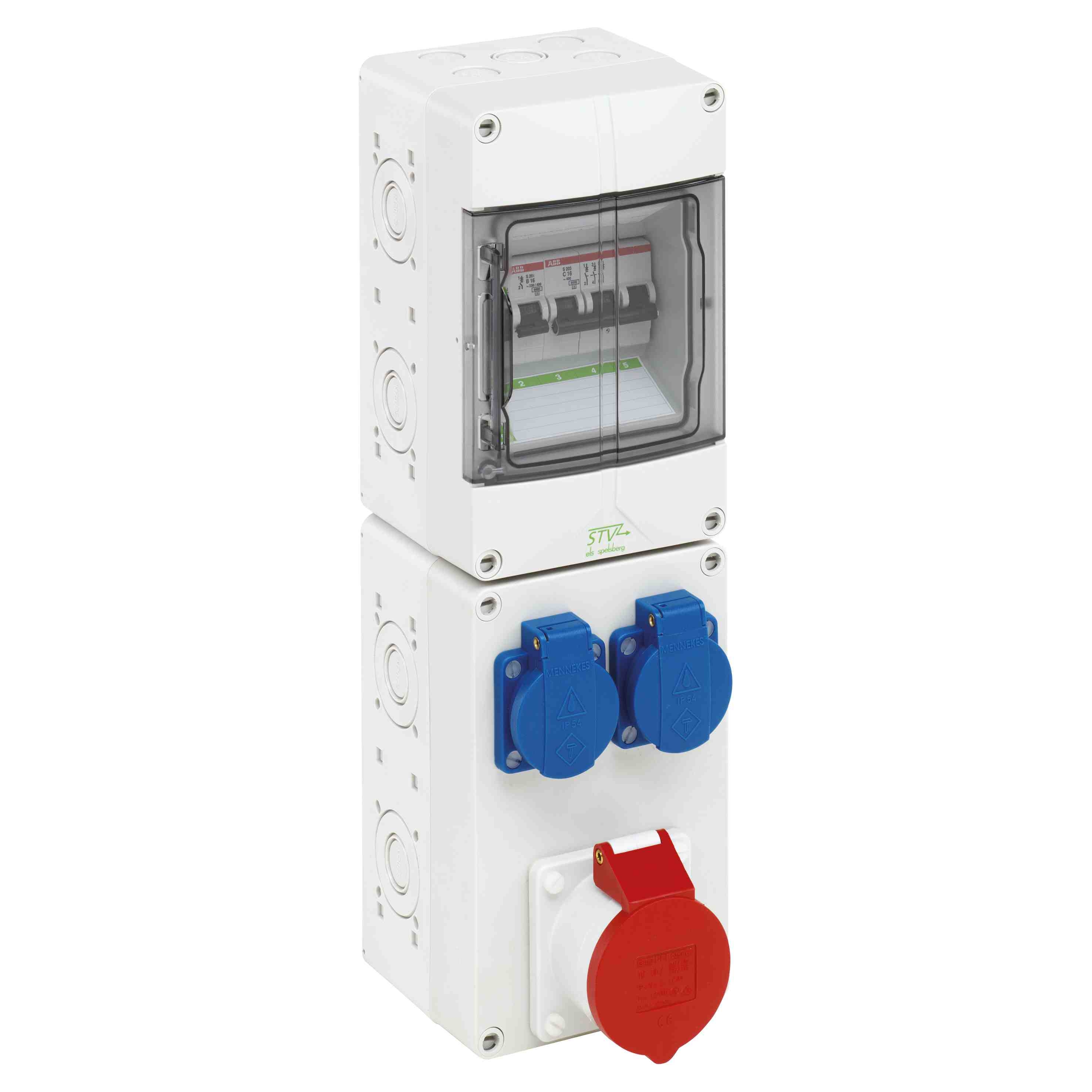 Zásuvková kombinace, se stupněm krytí IP44, připravená k zapojení, podle EN 61439-3, vysoká mechanická zatížitelnost, odolná vůči extrémním teplotám, kombinovatelná, vybaveny: 1 x Výkonový spínač V16A, 1-pólový 1 x Výkonový spínač C16A, 3-pólový 2 x SCHUKO® zásuvka (na přední straně), 230 V 1 x Zásuvka CEE (na přední straně) 16 A, 400 V Rozměry: 125 x 400 x 122 mm Přiložené příslušenství: Vývodka: 2x M25, 2x M32, Zaslepovací zátky, Krycí a popisovací pásky