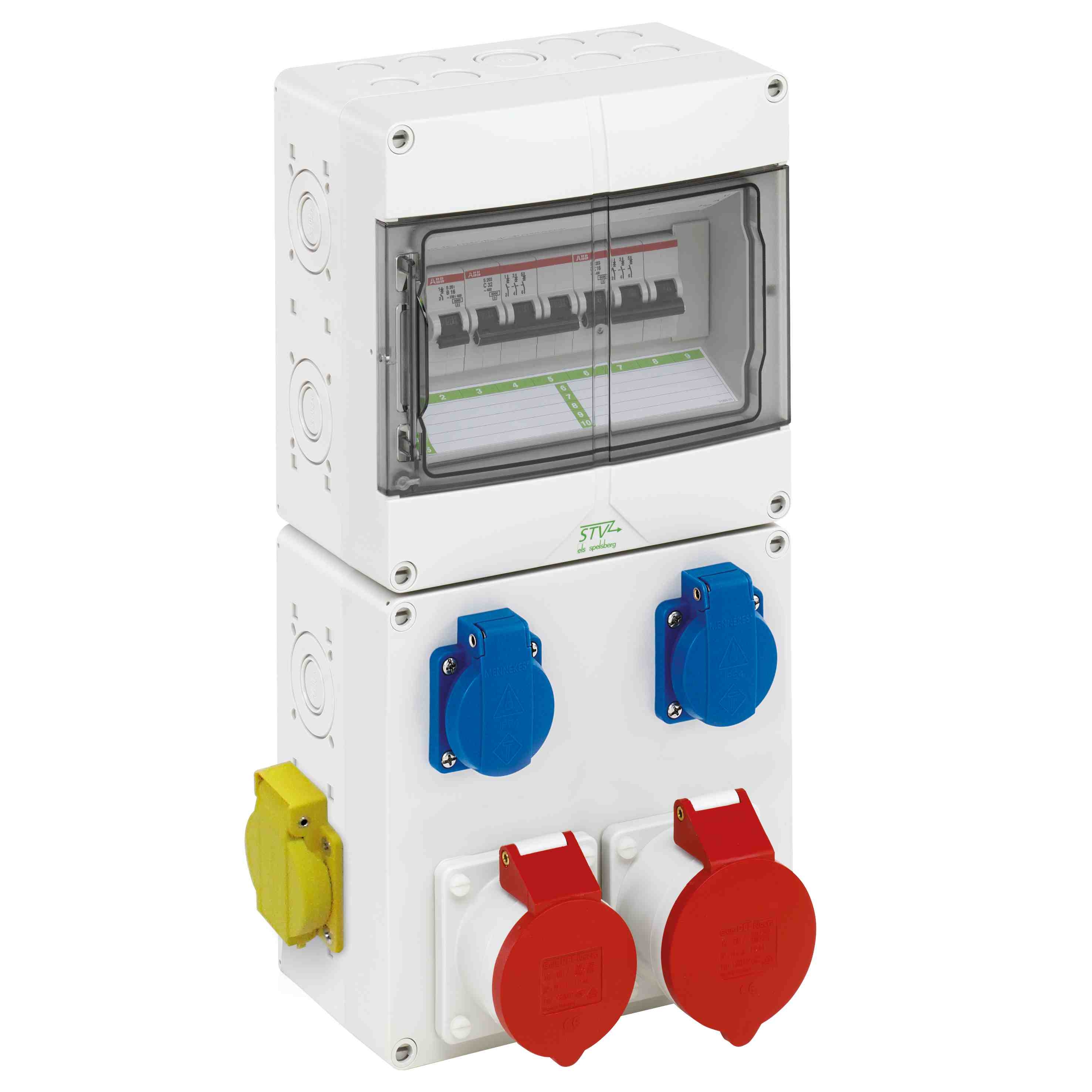 Zásuvková kombinace, se stupněm krytí IP44, připravená k zapojení, podle EN 61439-3, vysoká mechanická zatížitelnost, odolná vůči extrémním teplotám, kombinovatelná, vybaveny: 2 x Výkonový spínač V16A, 1-pólový 1 x Výkonový spínač C16A, 3-pólový 1 x Výkonový spínač C32A, 3-pólový 2 x SCHUKO® zásuvka (na přední straně), 230 V 1 x Zásuvka CEE (na přední straně) 16 A, 400 V 1 x Zásuvka CEE (na přední straně) 32 A, 400 V 1 x Datová vestavná zásuvka, 1 x RJ45 CAT.6 (boční) Rozměry: 200 x 400 x 122 mm Přiložené příslušenství: Vývodka: 2x M25, 2x M32, Zaslepovací zátky, Krycí a popisovací pásky