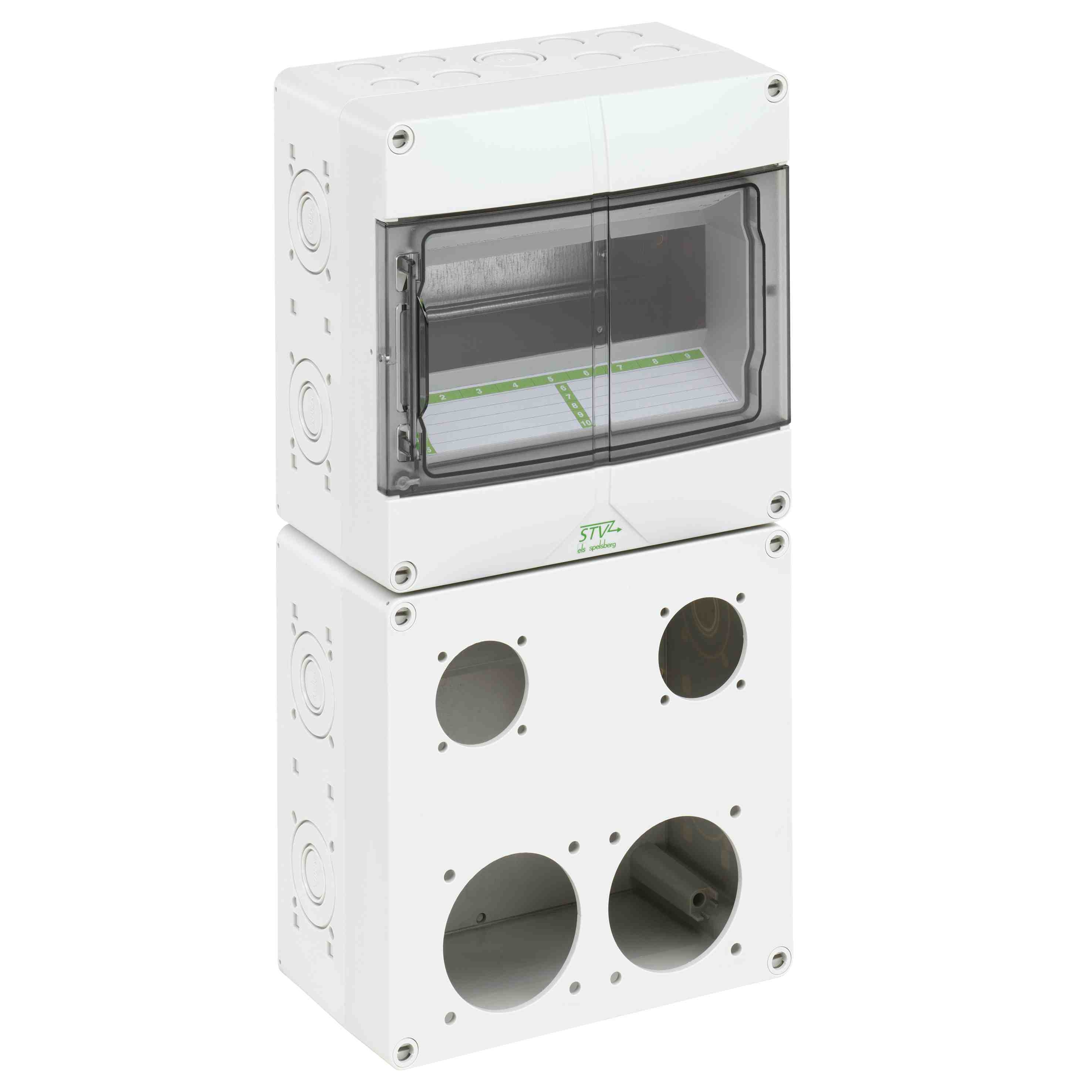 Spelsberg STV 922-L Prázdná zásuvková skříň, druh krytí IP44, 9 Mod., rázová houževnatost IK08, třída ochrany II, Jmenovité izolační napětí 400V AC, bez obsahu halogenů *72992201