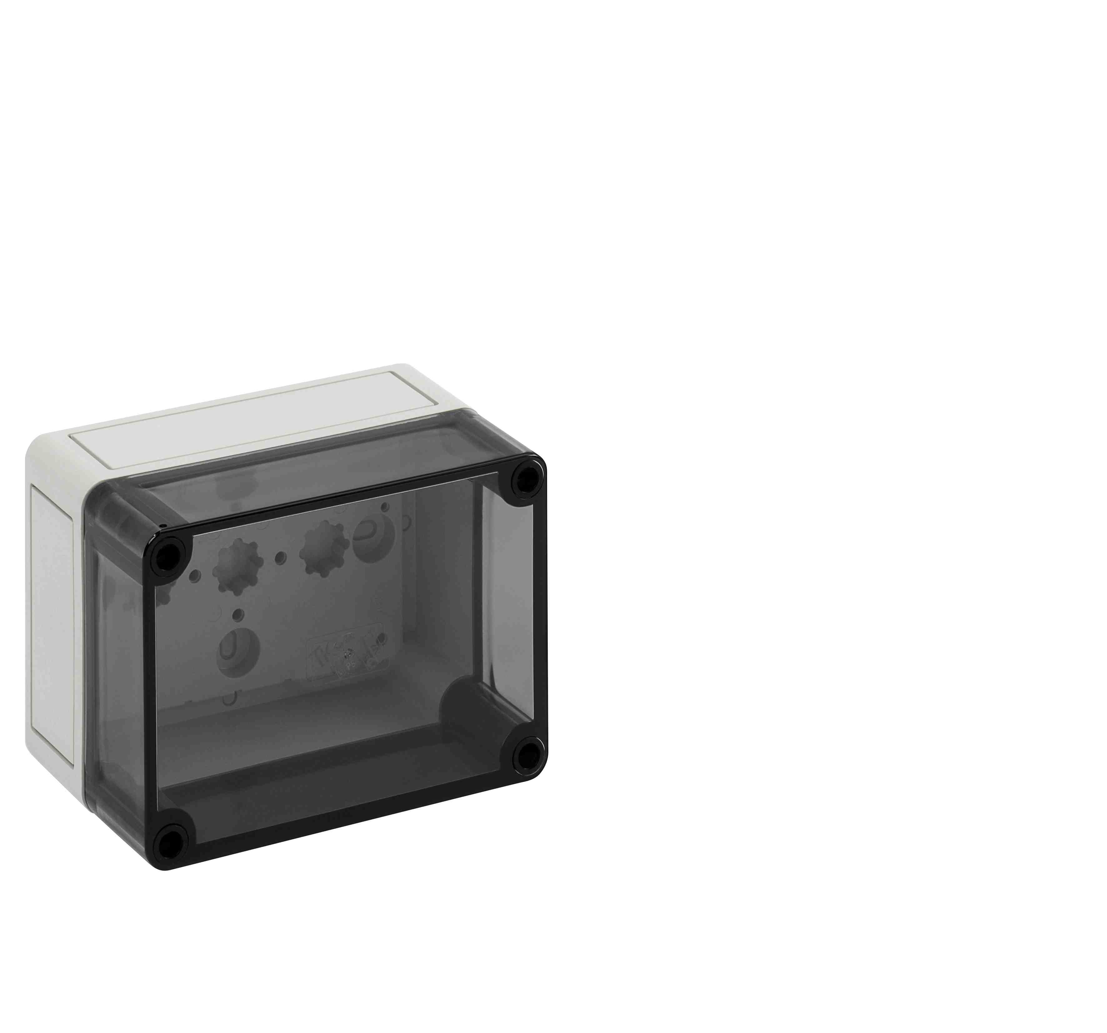 Prázdná skříň, se stupněm krytí IP66, polystyren, Ui=690V AC, Ui=1000V DC, Vnitřní místa pro připevnění, pro standardní instalace ve vnitřním prostoru, Krabice: polystyren, šedá, Víko: polykarbonát, transparenti, hladké boky Rozměry: 130 x 94 x 81 mm