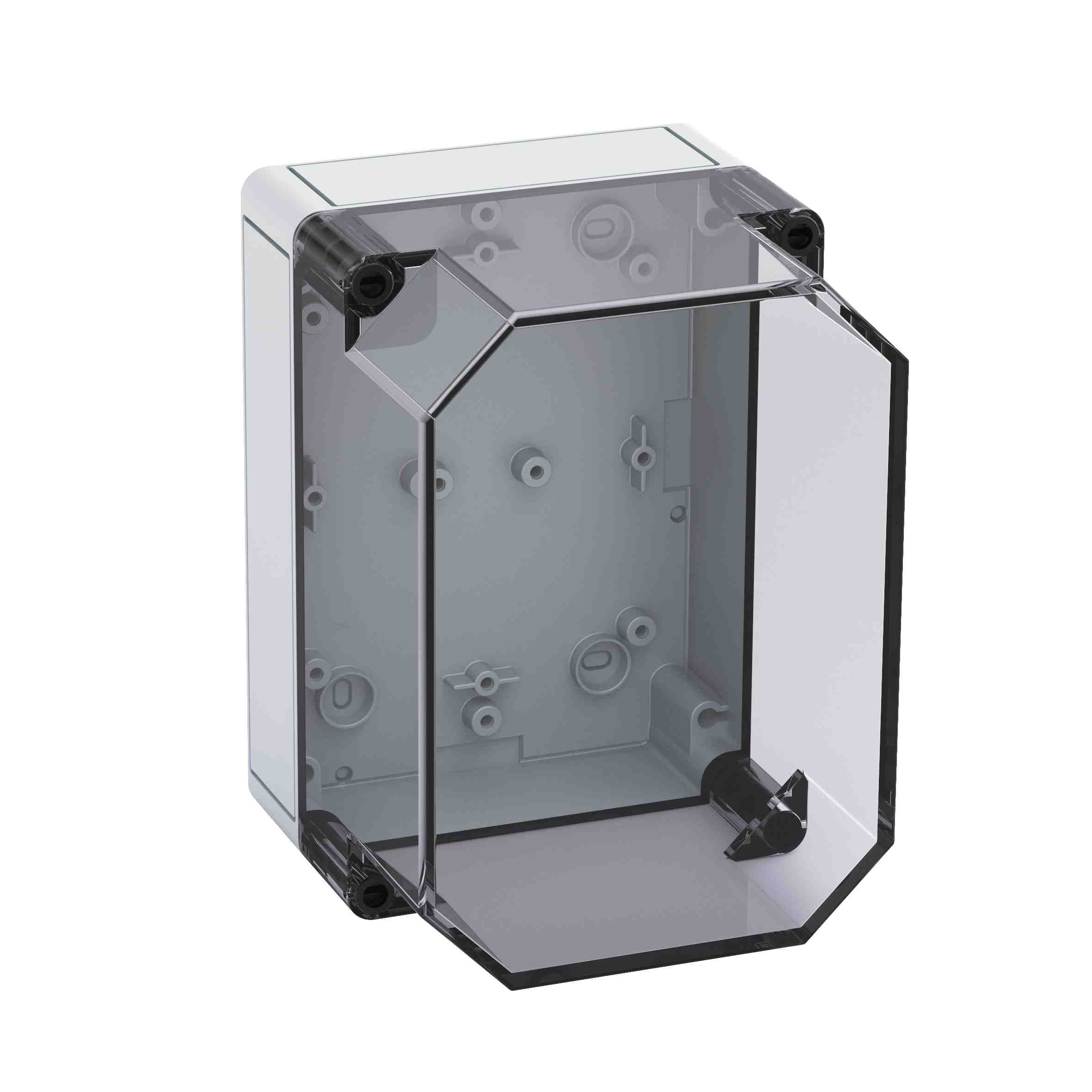 Prázdná skříň, se stupněm krytí IP66, polystyren, Ui=690V AC, Ui=1000V DC, Vnitřní místa pro připevnění, pro standardní instalace ve vnitřním prostoru, Krabice: polystyren, šedá, Víko: polykarbonát, transparenti, hladké boky Rozměry: 180 x 130 x 137 mm
