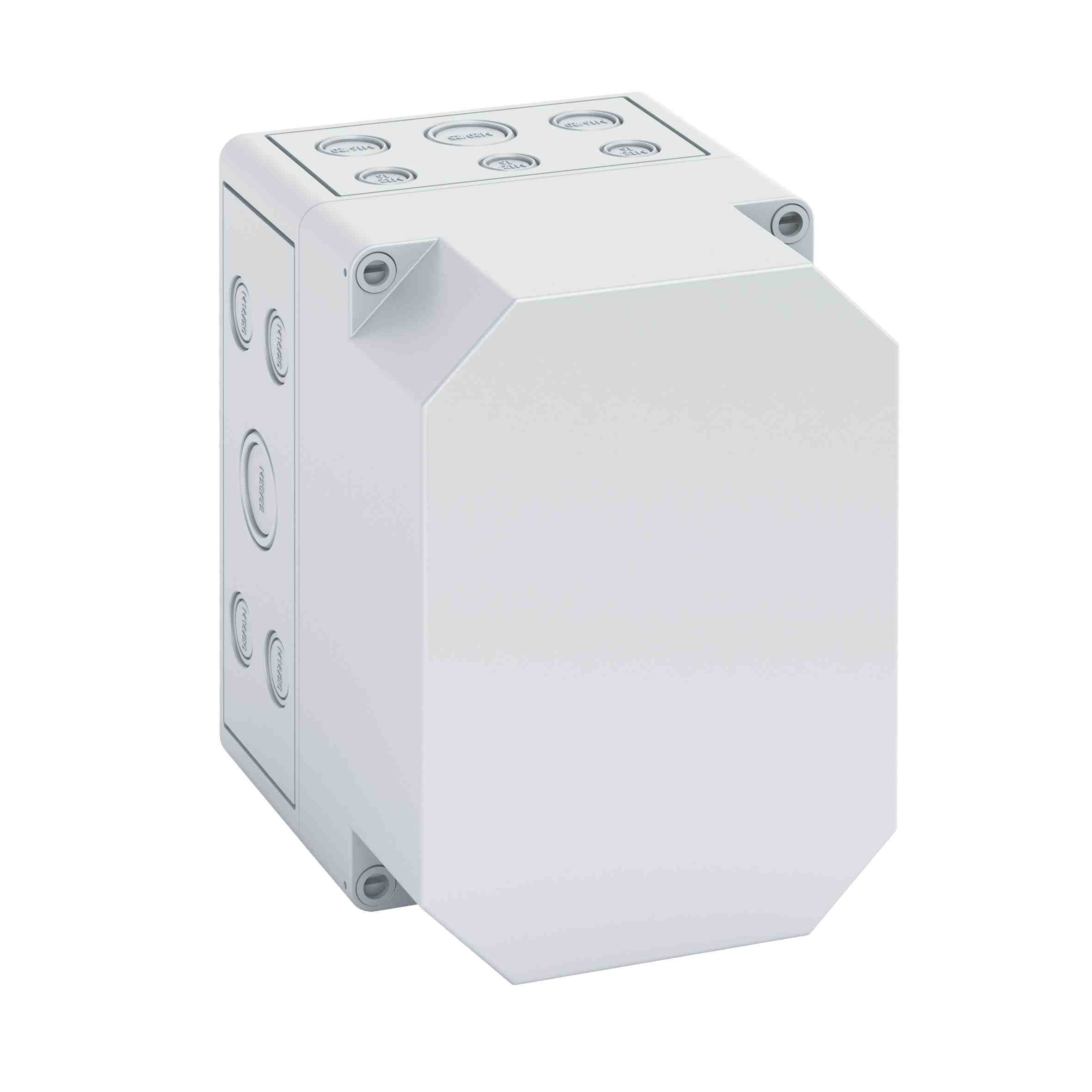Prázdná skříň, se stupněm krytí IP66, polystyren, Ui=690V AC, Ui=1000V DC, Vnitřní místa pro připevnění, pro standardní instalace ve vnitřním prostoru, Krabice: polystyren, šedá, Víko: polystyren, šedá, Vyrážecí membrány, M12/M16/M20/M25/M32, (23 bočně) Rozměry: 180 x 130 x 165 mm