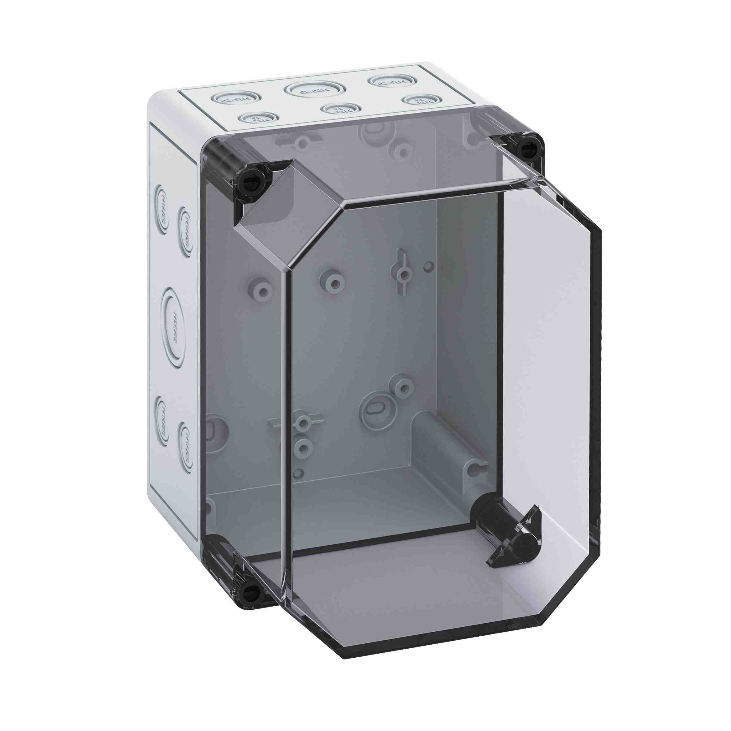 Prázdná skříň, se stupněm krytí IP66, polystyren, Ui=690V AC, Ui=1000V DC, Vnitřní místa pro připevnění, pro standardní instalace ve vnitřním prostoru, Krabice: polystyren, šedá, Víko: polykarbonát, transparenti, Vyrážecí membrány, M12/M16/M20/M25/M32, (23 bočně) Rozměry: 180 x 130 x 165 mm