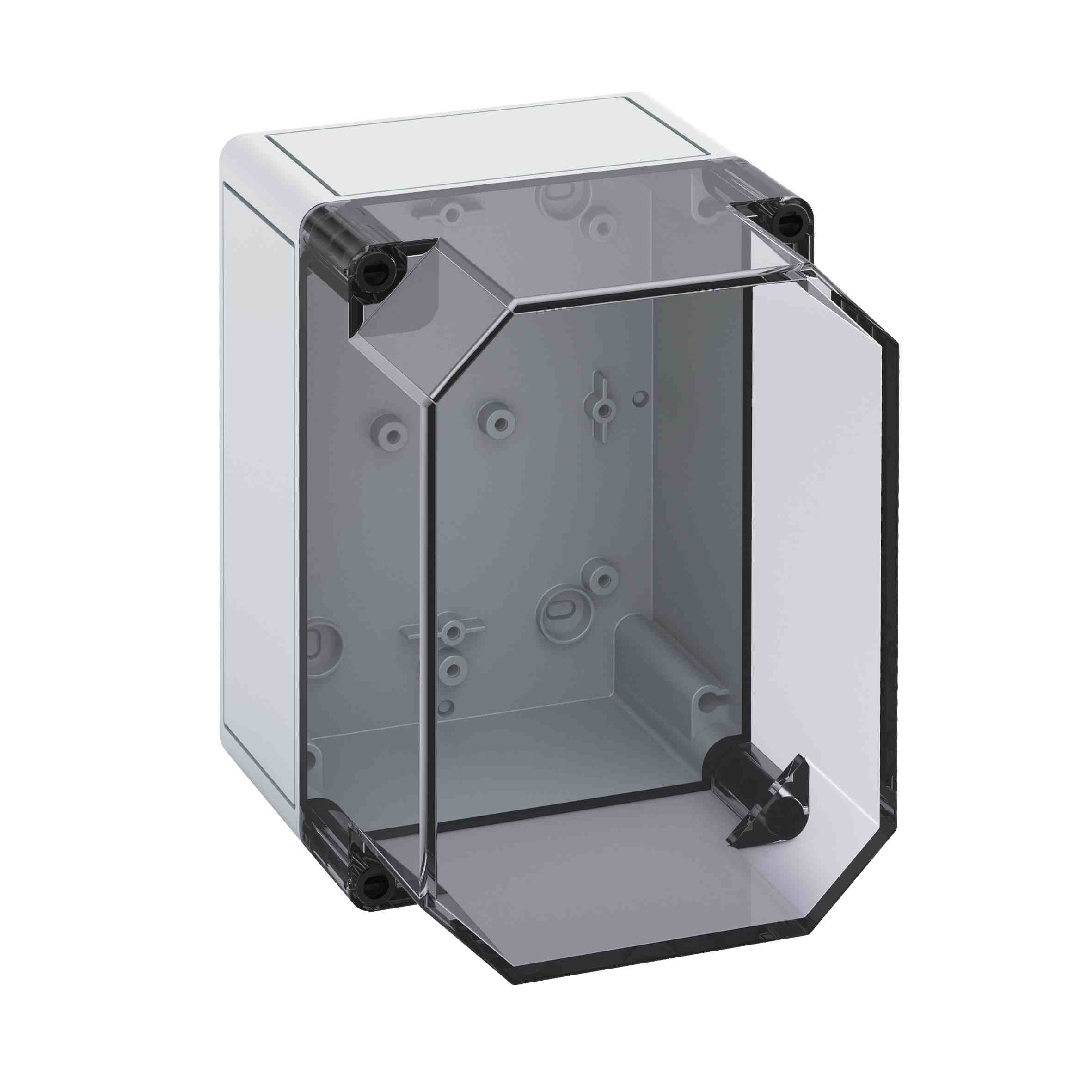 Prázdná skříň, se stupněm krytí IP66, polystyren, Ui=690V AC, Ui=1000V DC, Vnitřní místa pro připevnění, pro standardní instalace ve vnitřním prostoru, Krabice: polystyren, šedá, Víko: polykarbonát, transparenti, hladké boky Rozměry: 180 x 130 x 165 mm