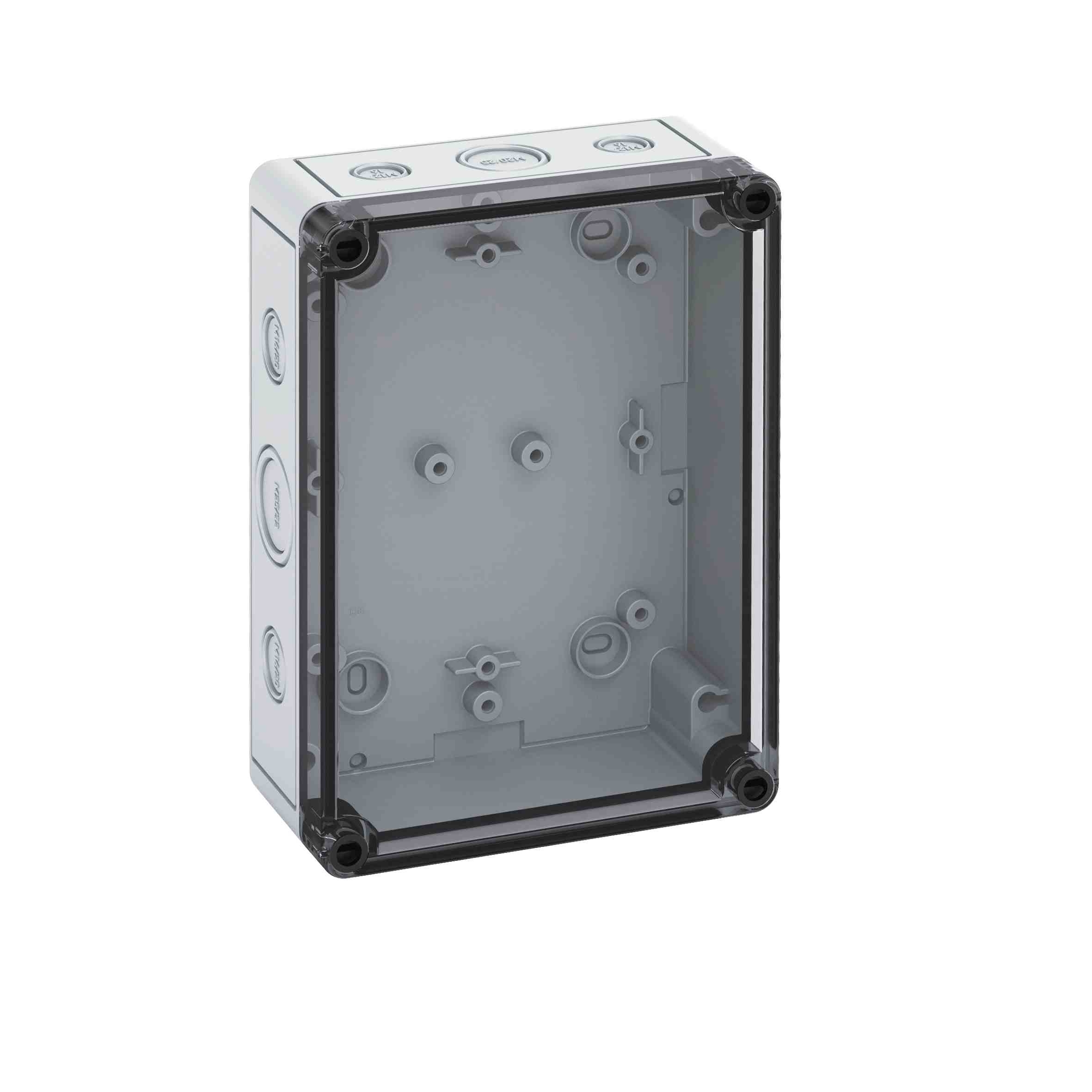 Prázdná skříň, se stupněm krytí IP66, polystyren, Ui=690V AC, Ui=1000V DC, Vnitřní místa pro připevnění, pro standardní instalace ve vnitřním prostoru, Krabice: polystyren, šedá, Víko: polykarbonát, transparenti, Vyrážecí membrány, M12/M16/M20/M25/M32, (14 bočně) Rozměry: 180 x 130 x 63 mm