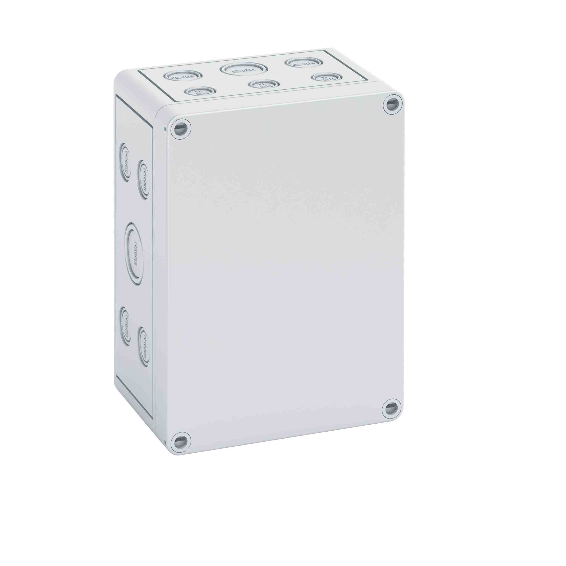 Prázdná skříň, se stupněm krytí IP66, polystyren, Ui=690V AC, Ui=1000V DC, Vnitřní místa pro připevnění, pro standardní instalace ve vnitřním prostoru, Krabice: polystyren, šedá, Víko: polystyren, šedá, Vyrážecí membrány, M12/M16/M20/M25/M32, (23 bočně) Rozměry: 180 x 130 x 90 mm