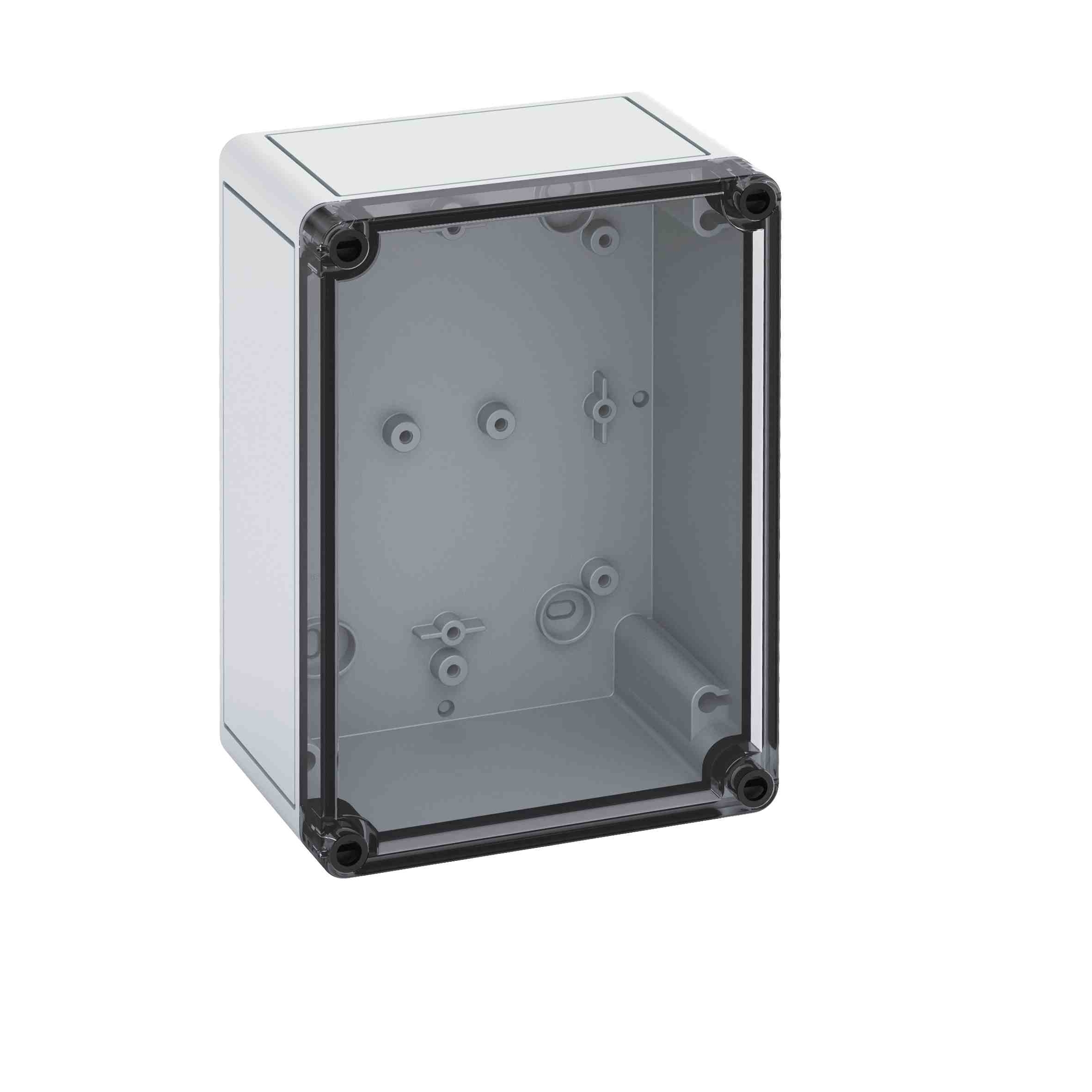 Prázdná skříň, se stupněm krytí IP66, polystyren, Ui=690V AC, Ui=1000V DC, Vnitřní místa pro připevnění, pro standardní instalace ve vnitřním prostoru, Krabice: polystyren, šedá, Víko: polykarbonát, transparenti, hladké boky Rozměry: 180 x 130 x 90 mm