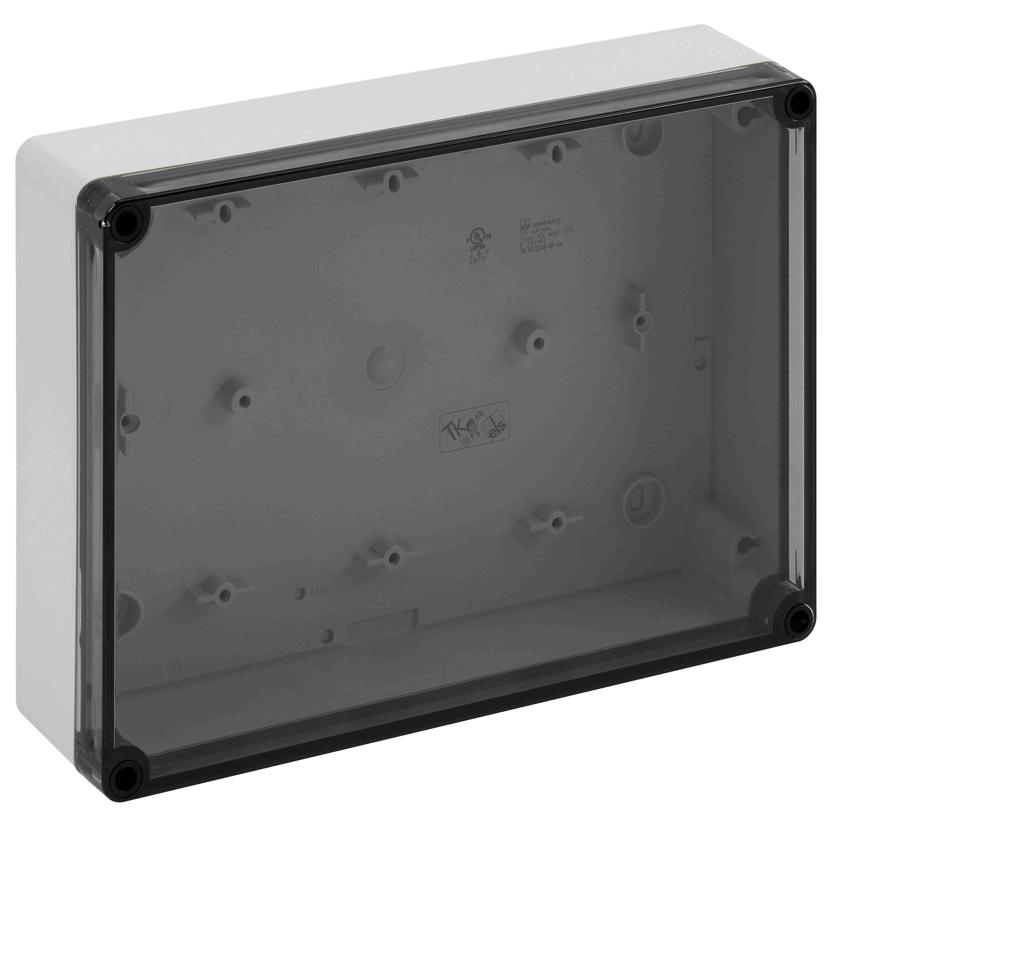 Prázdná skříň, se stupněm krytí IP66, polystyren, Ui=690V AC, Ui=1000V DC, Vnitřní místa pro připevnění, pro standardní instalace ve vnitřním prostoru, Krabice: polystyren, šedá, Víko: polykarbonát, transparenti, hladké boky Rozměry: 254 x 180 x 63 mm