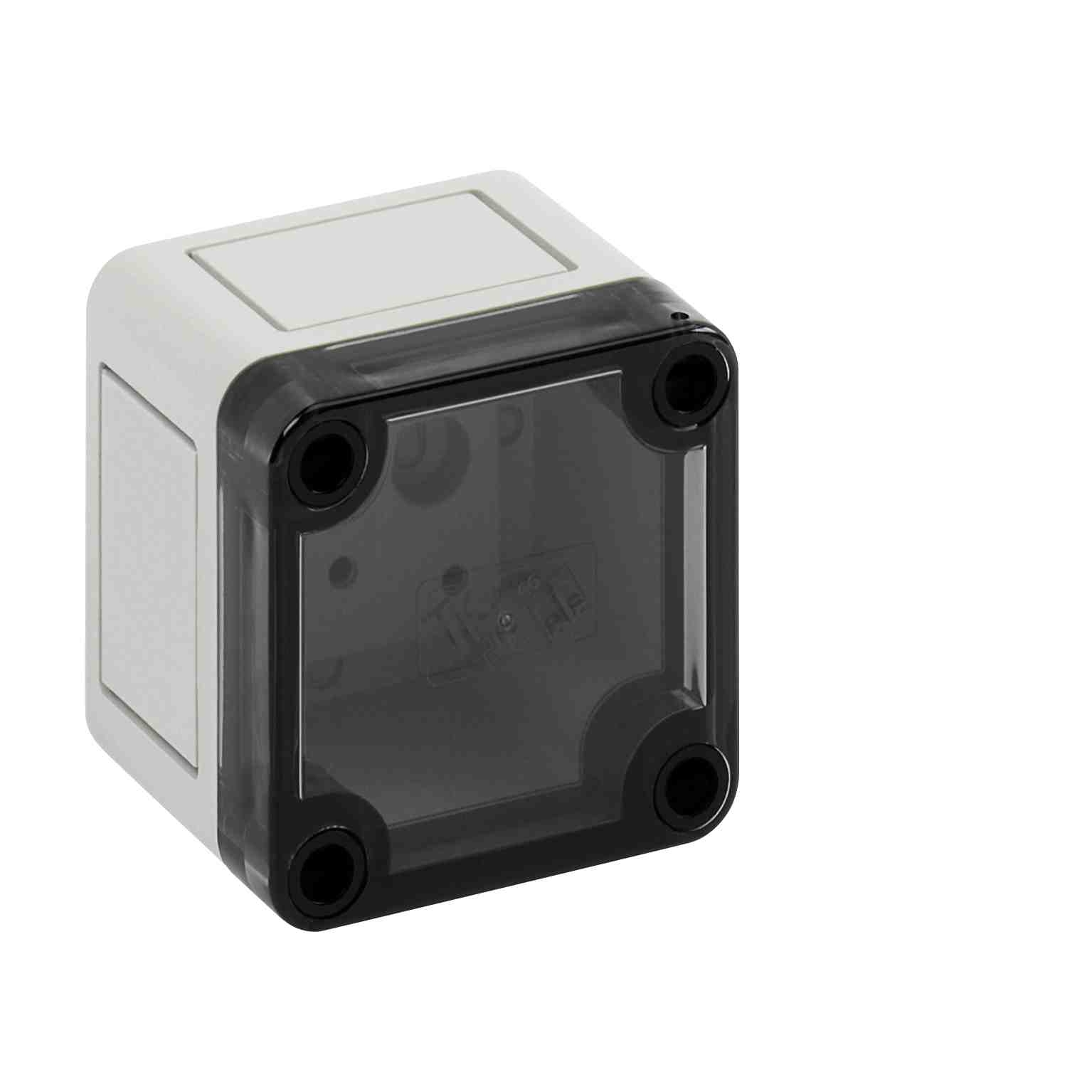 Prázdná skříň, se stupněm krytí IP66, polystyren, Ui=690V AC, Ui=1000V DC, Vnitřní místa pro připevnění, pro standardní instalace ve vnitřním prostoru, Krabice: polystyren, šedá, Víko: polykarbonát, transparenti, hladké boky Rozměry: 65 x 65 x 57 mm