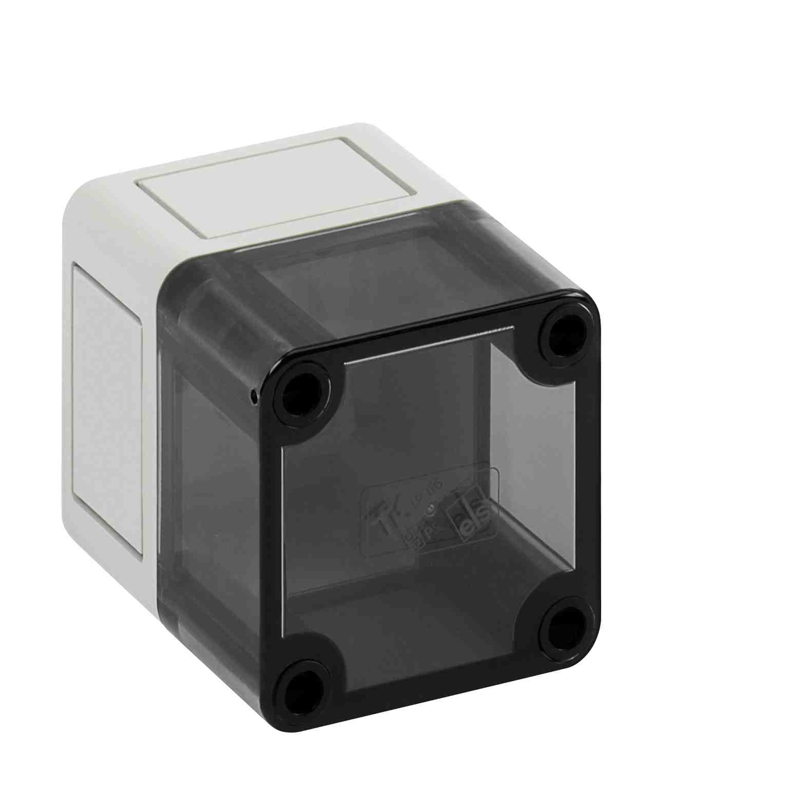 Prázdná skříň, se stupněm krytí IP66, polystyren, Ui=690V AC, Ui=1000V DC, Vnitřní místa pro připevnění, pro standardní instalace ve vnitřním prostoru, Krabice: polystyren, šedá, Víko: polykarbonát, transparenti, hladké boky Rozměry: 65 x 65 x 81 mm