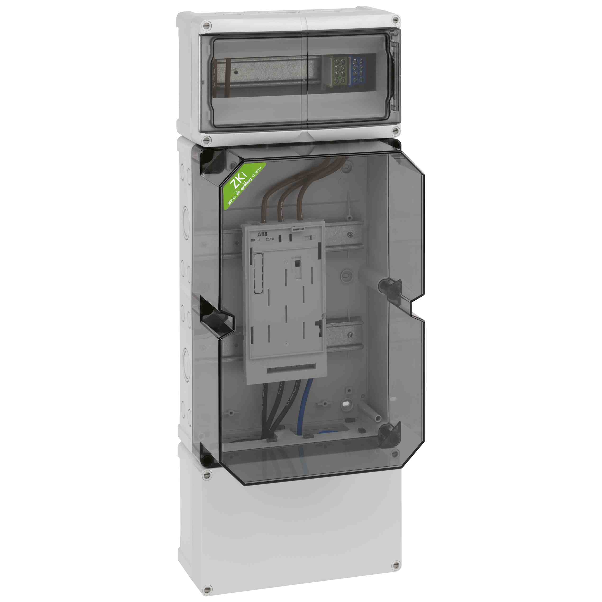 Skříň elektroměru - průmyslová kvalita -, s transparentním víkem, sériově plombovatelné, s namontovaným adaptérem BKE-I pro elektronický domovní elektroměr, sériově plombovatelný spotřebitelský prostor nahoře, s 35mm DIN lištou a dvojitou svorkou PE/N, sériově plombovatelný spotřebitelský prostor dole, s 35mm DIN lištou a 5pólovou svorkou HA 25/16 mm?, s hrdlem s dvojitou membránou, Zaslepovací zátka a izolační krytka, Rozměry: 250 x 670 x 193 mm