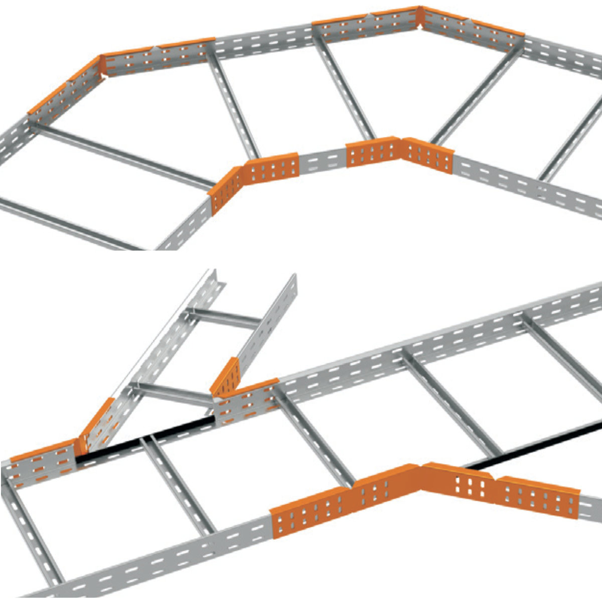 Vnější spojka kabelové lávky umožňující vytvoření odbočení pod různým úhlem, určena pro spojování lávek s výškou bočnice 60 mm současně s dlouhou spojkou pro kabelové lávky vyráběné v provedení z nerezového materiálu