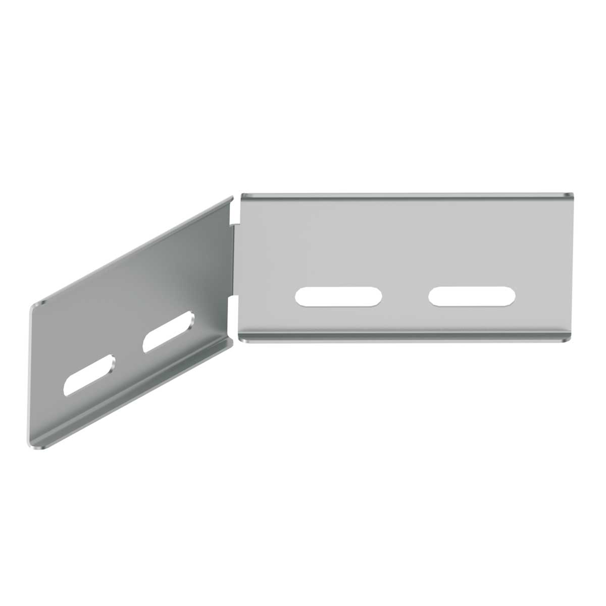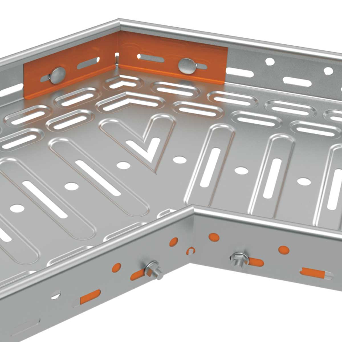 Úhlová spojka pro vytvoření oblouku kabelové trasy výšky bočnice 100 mm v horizontálním směru v úhlu 0°až cca 120°, povrchová úprava geomet je určena pro žárově zinkované kabelové žlaby