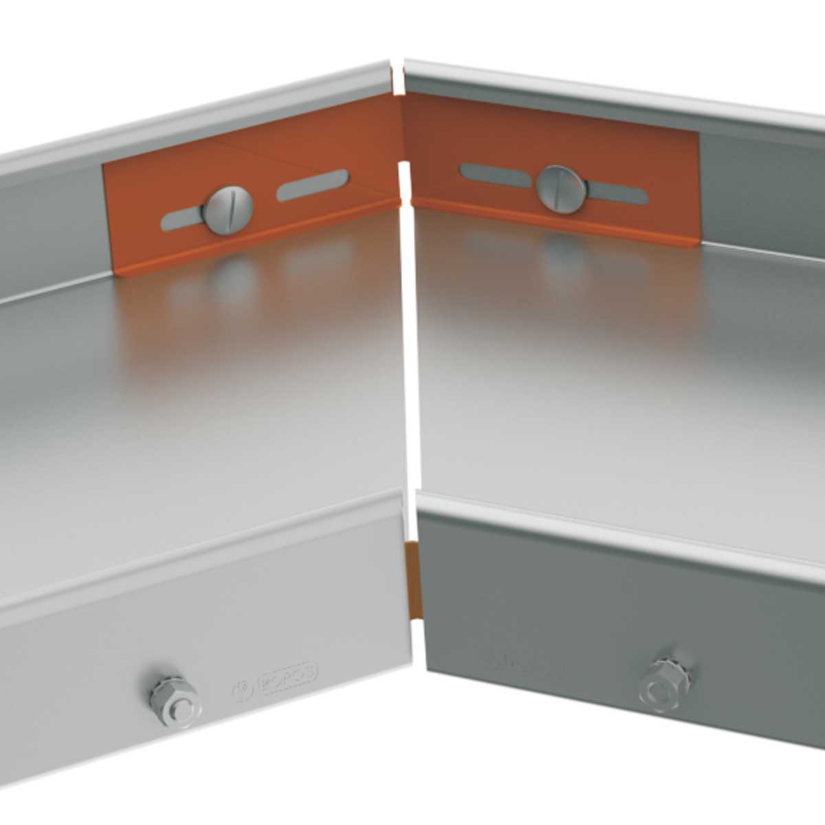 Úhlová spojka pro spojení nerezových kabelových žlabů výšky bočnice 100 mm, spojení se provádí pomocí šroubů