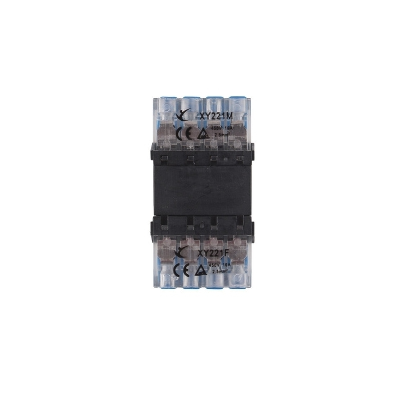 Konektor s páčkou pro snadné a rychlé připojení vodičů bez použití nástrojů. Pár vidlice + zásuvka, IP20, 4-pól, max. 250V/16A, pro kabely s průřezy 0,5-4mm². Rozměry ve spojeném stavu: 55x29x11mm