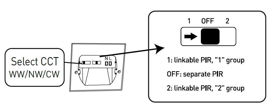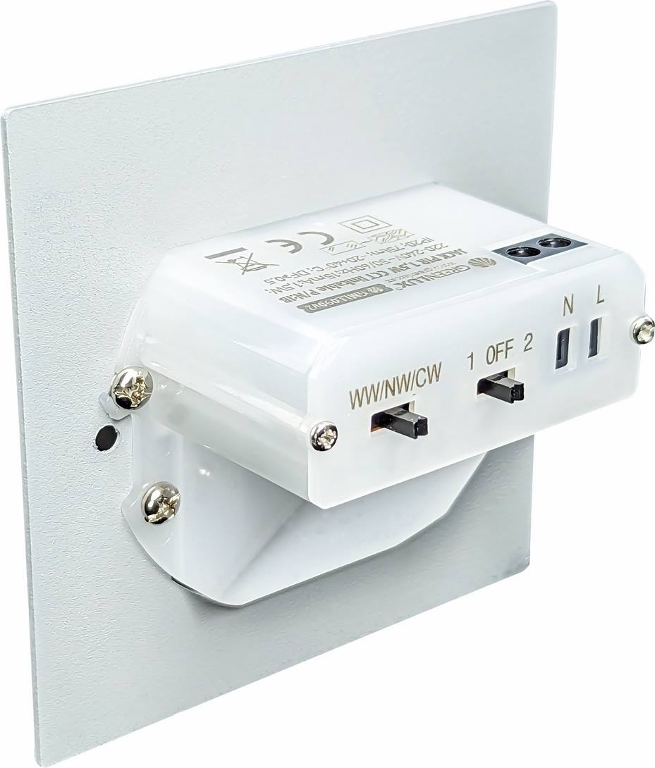 Přepínače umístěné na zabudované části svítidla umožňují nastavení teploty světla a možnost vytvořit společně spínanou skupinu svítidel.
