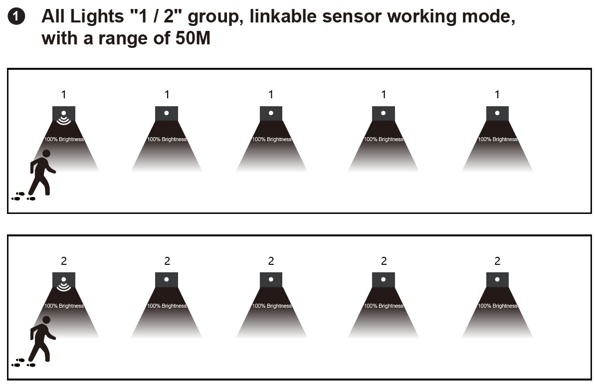 (Poznámka pro mód 1 a 2: V případě že jedno ze svítidel z vytvořené skupiny detekuje pohyb, tak spíná celá skupina svítidel).