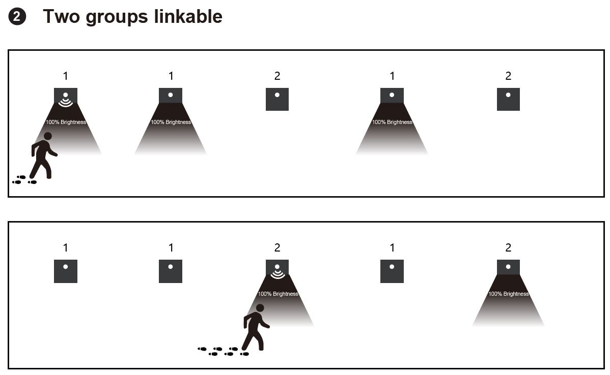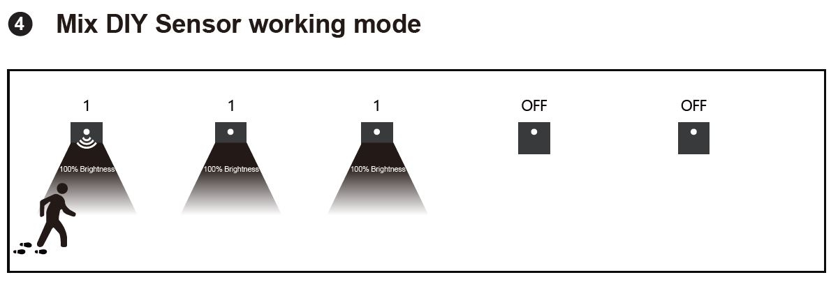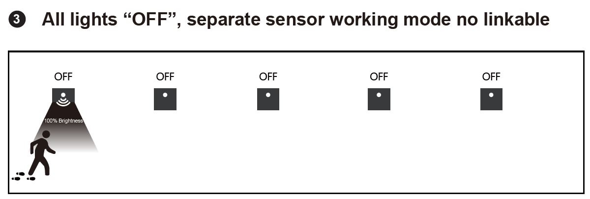 MÓD OFF – svítidlo funguje samostatně a při detekci pohybu spíná individuálně.