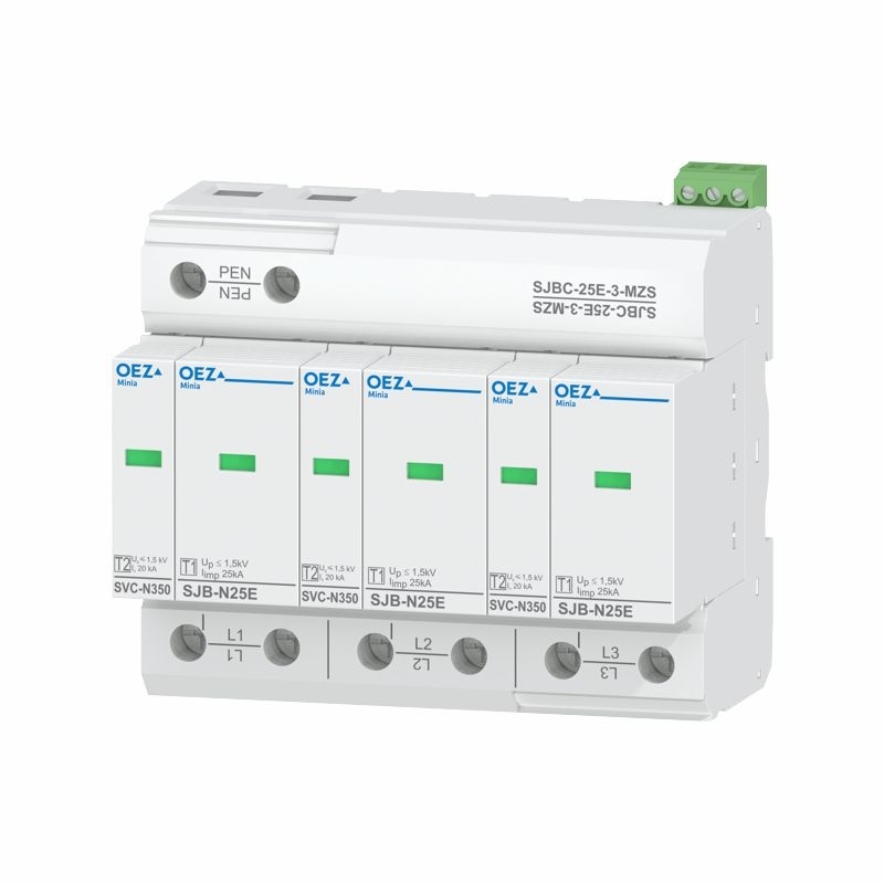 Kombinovaný svodič bleskových proudů a přepětí SJBC-25E-3-MZS typ 1+2, Iimp 25 kA, Uc AC 350 V, zapojení 3+0, výměnné moduly, se signalizací, jiskřiště, varistor OEZ:38361