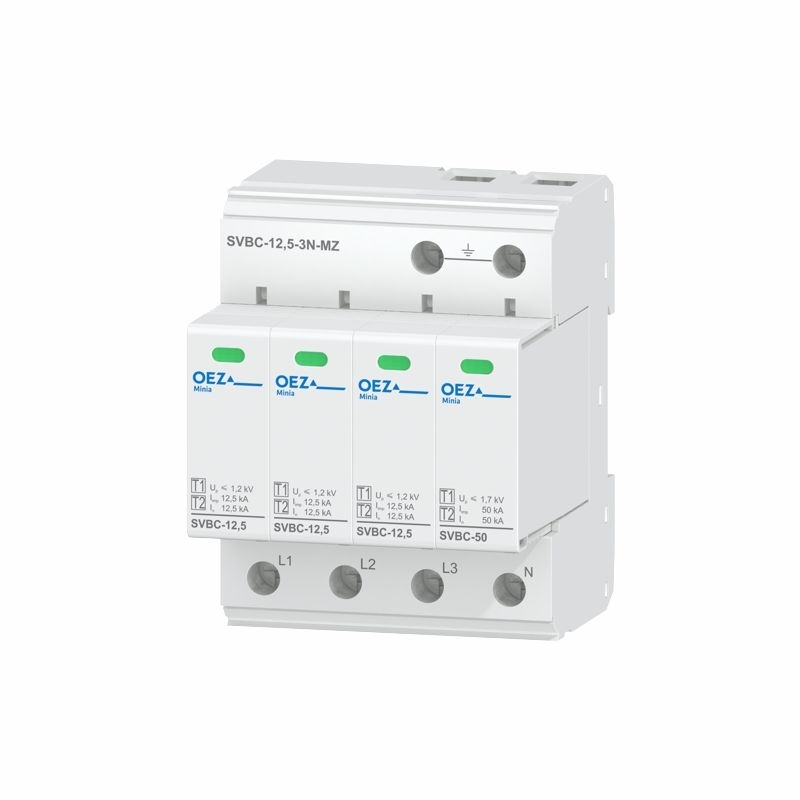 Kombinovaný svodič bleskových proudů a přepětí SVBC-12,5-3N-MZ typ 1+2, Iimp 12,5 kA, Uc AC 335 V, zapojení 3+1, výměnné moduly, varistor, jiskřiště OEZ:40621