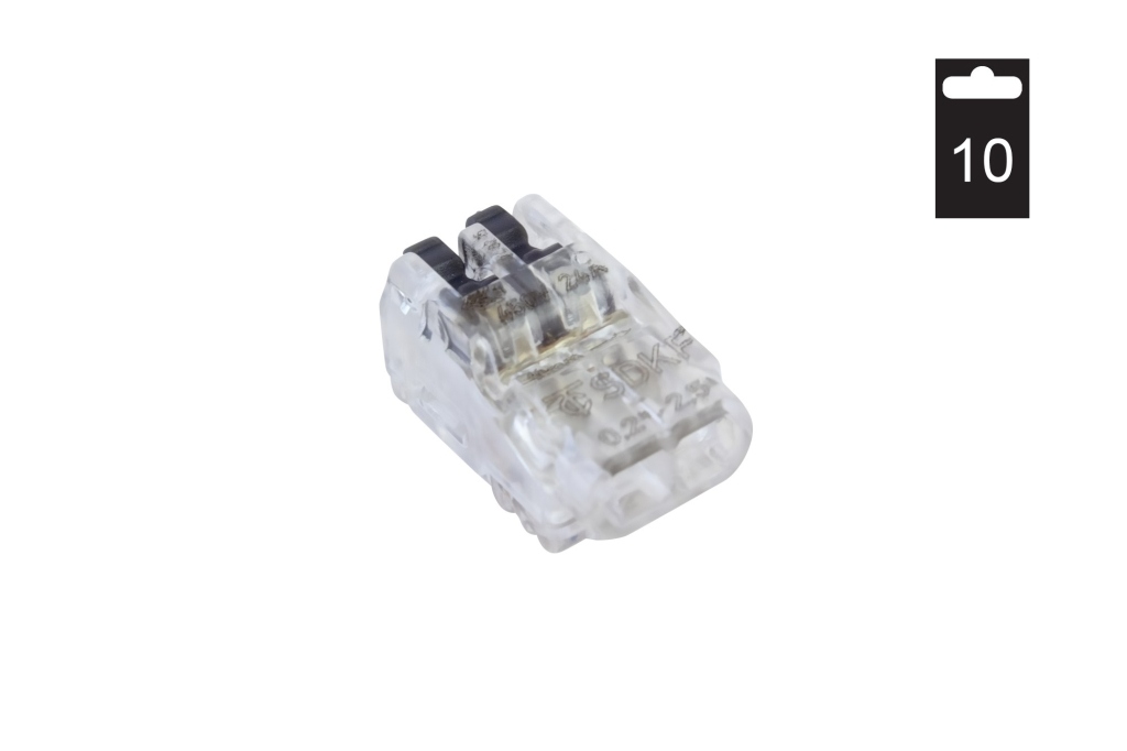 Svorka krabicová páčková SDKF 2/10 TR-AN - univerzální (pevný i laněný vodič), bezšroubová, 2x0,2-2,5mm2, transparentní, balení v praktickém sáčku po 10ks.