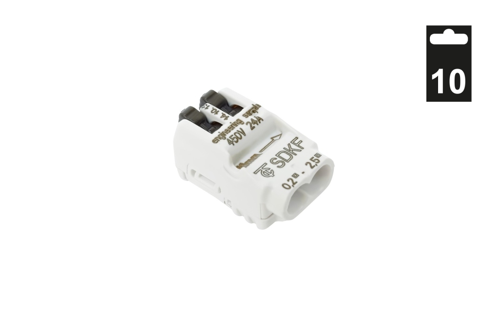 Svorka krabicová páčková SDKF 2/10 - univerzální (pevný i laněný vodič), bezšroubová, 2x0,2-2,5mm2, bílá, balení v praktickém sáčku po 10ks.