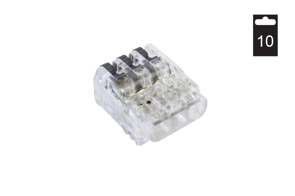Svorka krabicová páčková SDKF 3/10 TR-AN - univerzální (pevný i laněný vodič), bezšroubová, 3x0,2-2,5mm2, transparentní, balení v praktickém sáčku po 10ks.